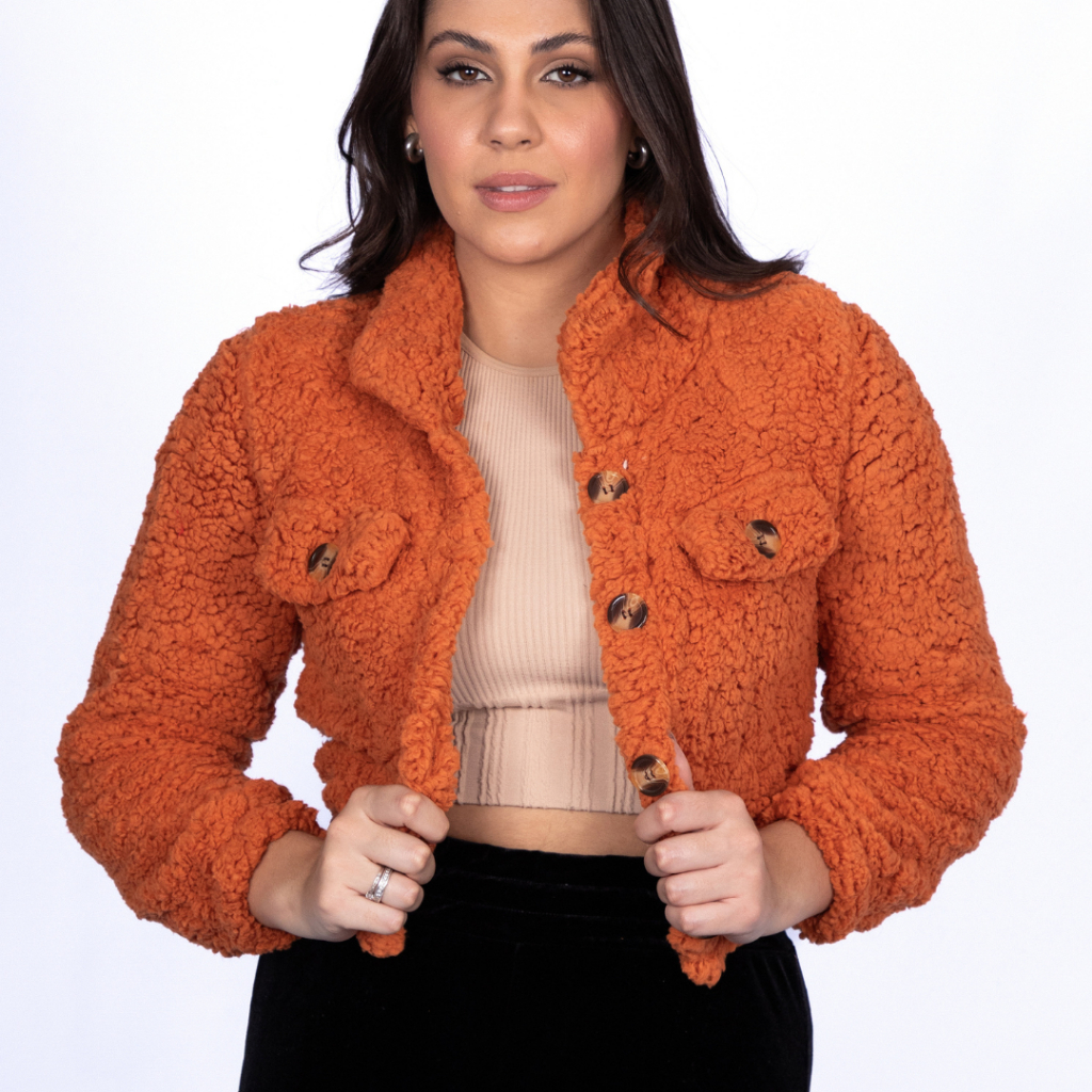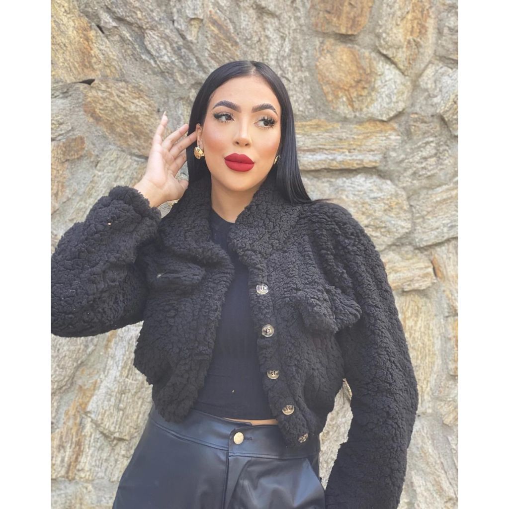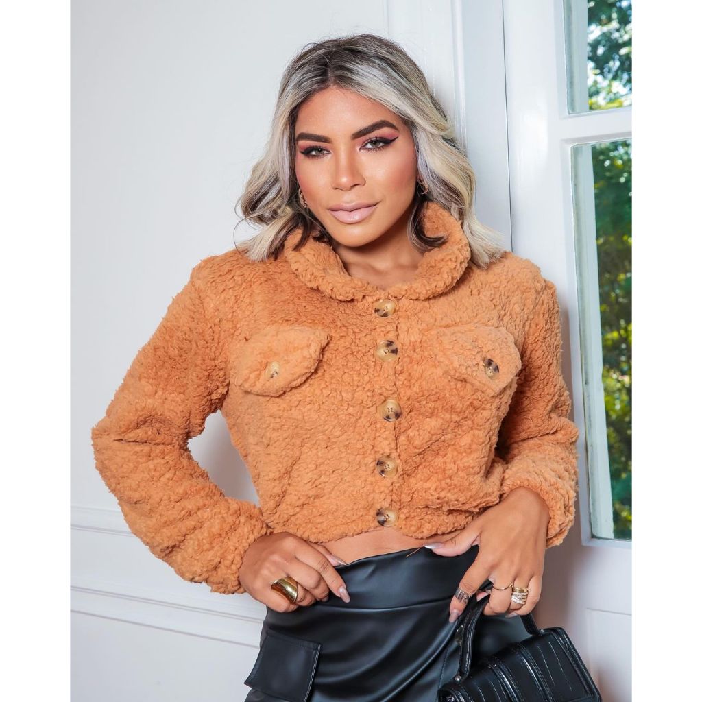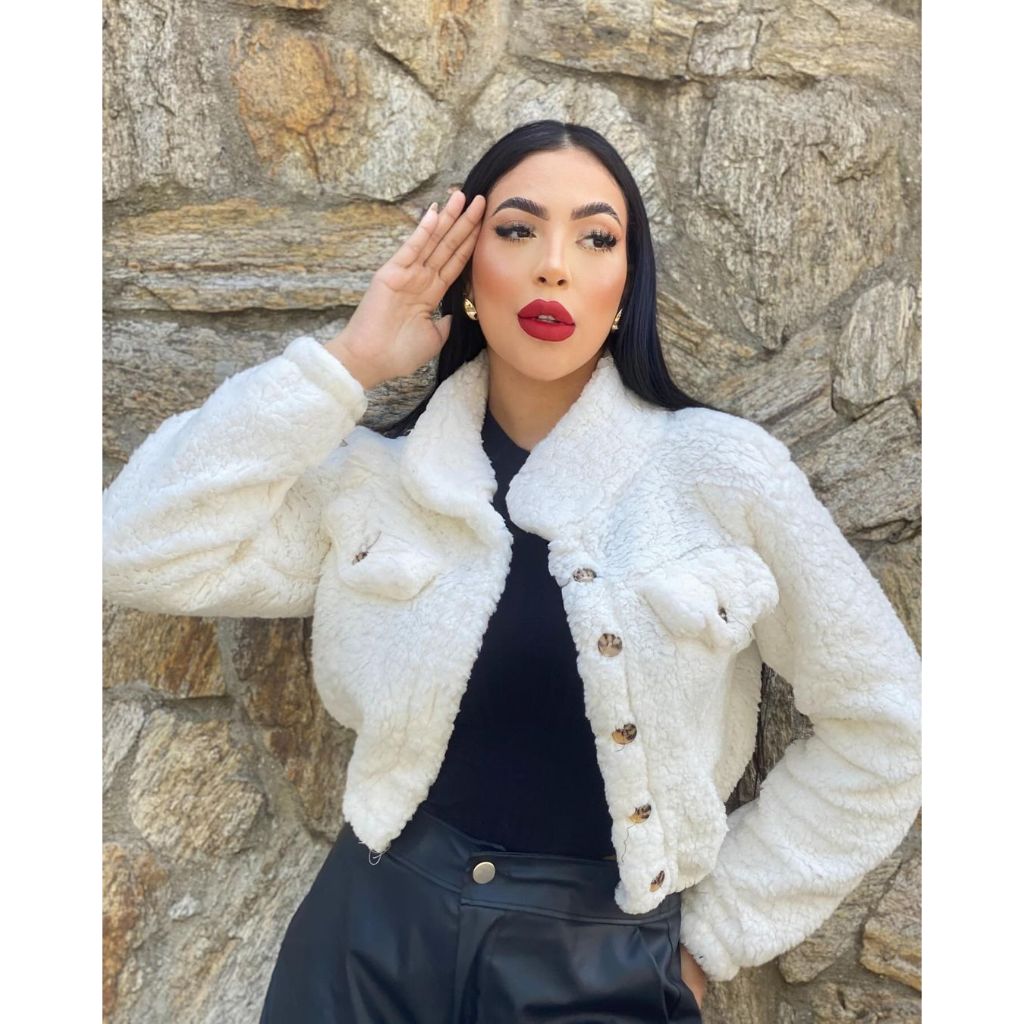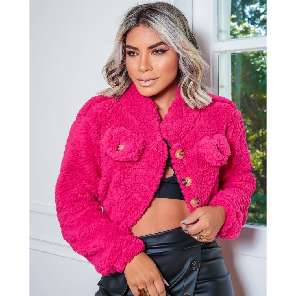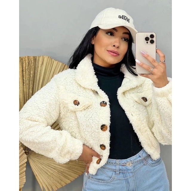 Casaco Teddy curto Jaqueta de botão Moda Feminino Felpudo Pelo Urso pelos urso eloquencia Blogueirinha