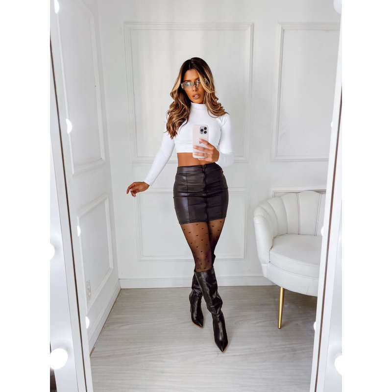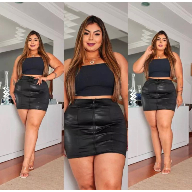 Saia Feminina De Couro Fake Tecido Cirre Saia Preta com Ziper