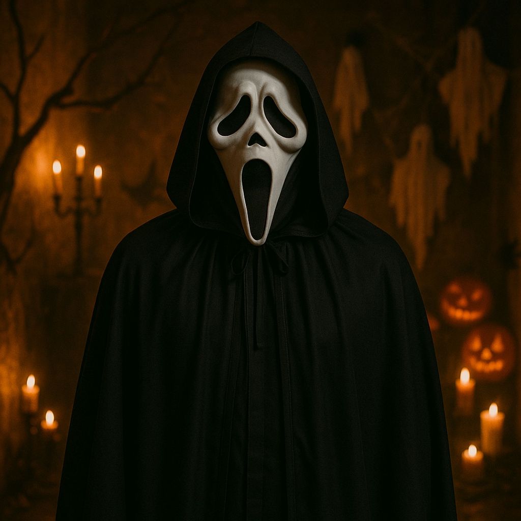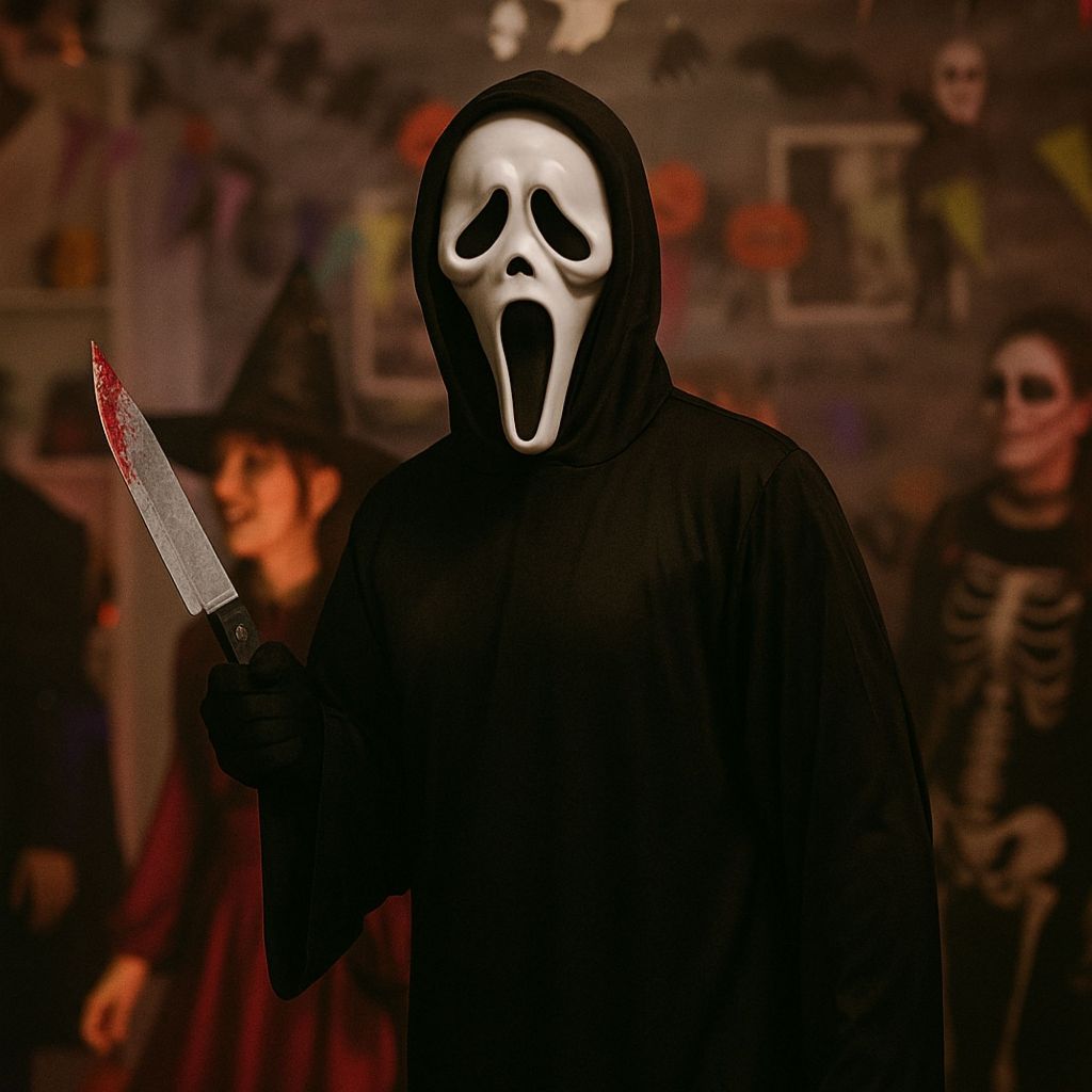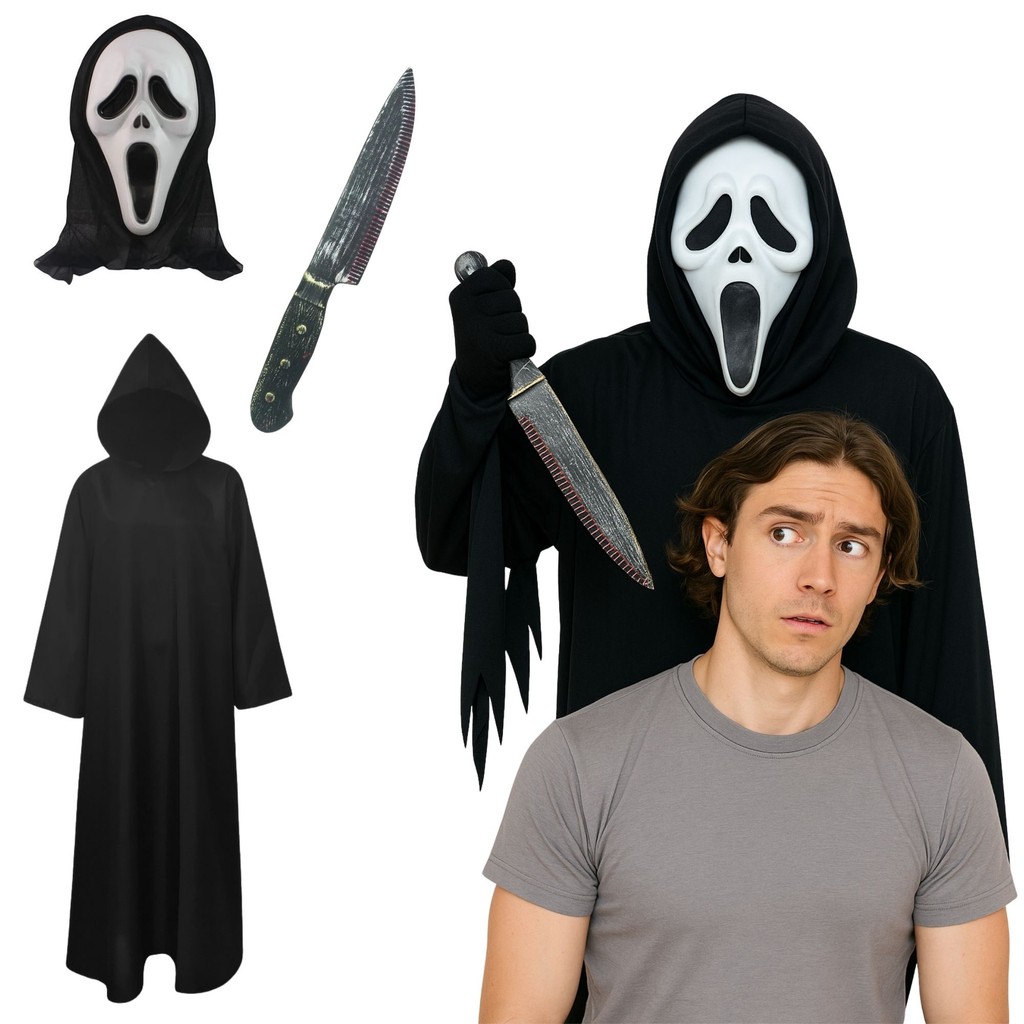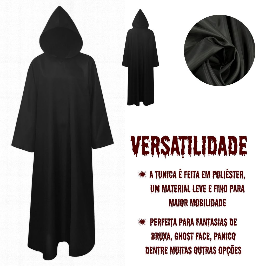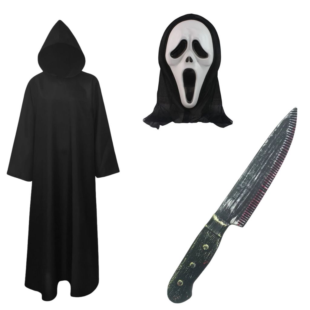 Fantasia Pânico Ghostface Completa Kit Tunica Preta Máscara Faca Slasher Assassino Halloween