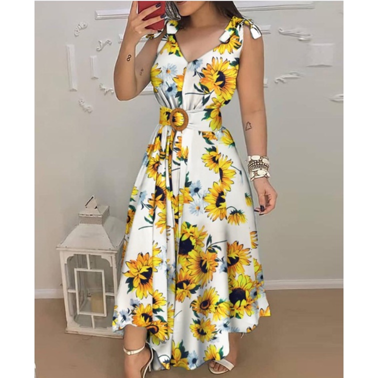 Vestido Longo Feminino Floral Boho Estampado Cinto Balanço Sem Mangas Com Decote Em V