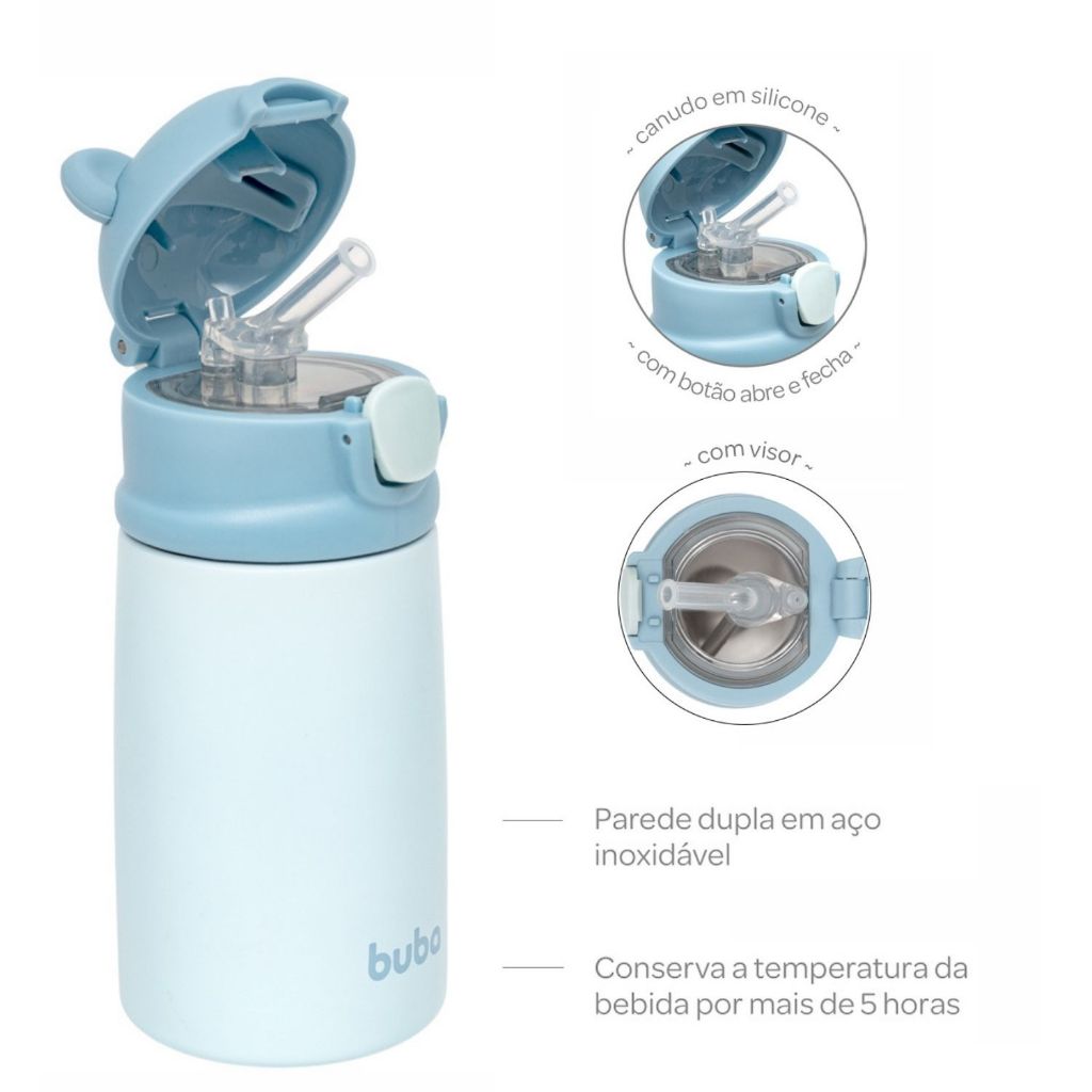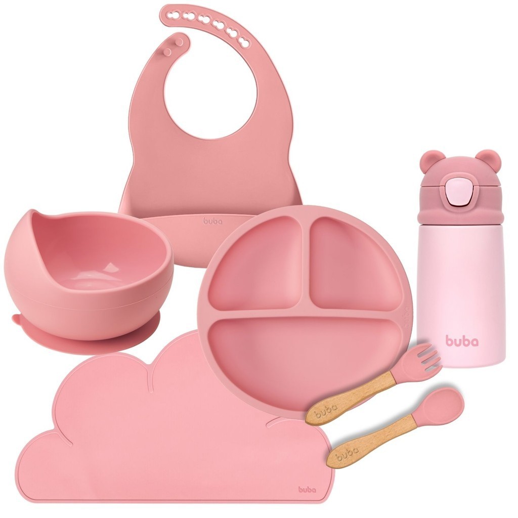 Kit Alimentação Bebê 6 Peças Buba Prato, Talheres, Garrafa Térmica, Babador, Bowl e Jogo Americano em Silicone