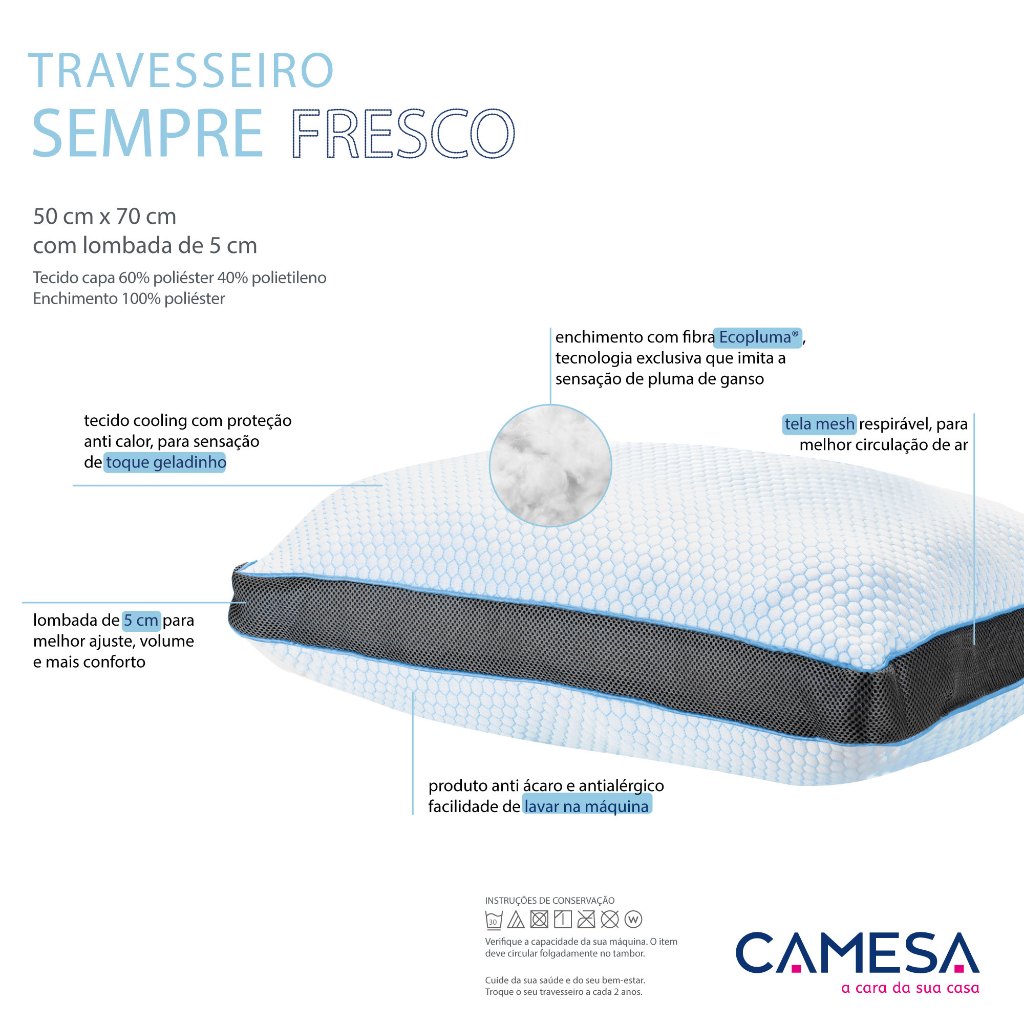 Travesseiro 50x70cm com Lombada 5cm Sempre Fresco Camesa