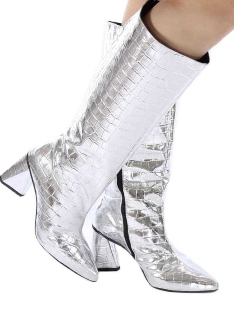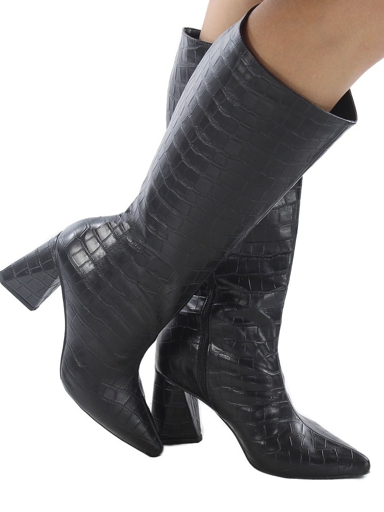 Bota Feminina Croco Salto Grosso Geométrico 7,5cm Bico Fino Luxo Confortável Antiderrapante