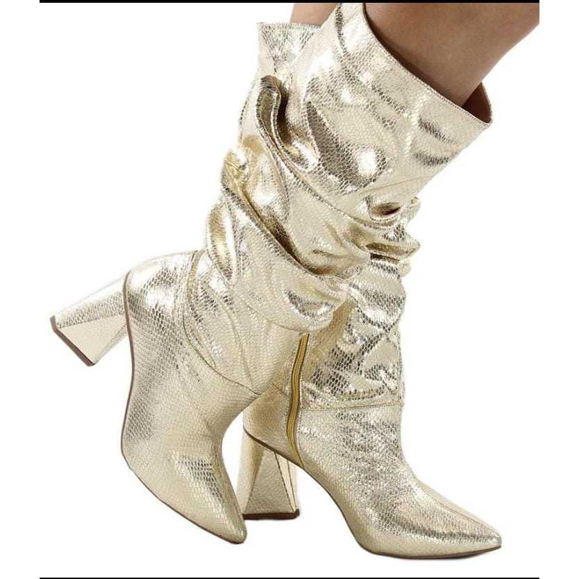 Bota Feminina Slouchy Enrugada Cano Alto Salto Geométrico Grosso 7,5 cm Bico Fino Confortável