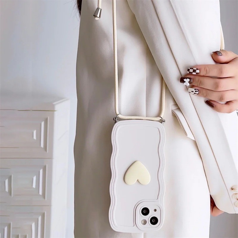 Cor Colar De Luxo Corpo Cruzado Lanyard 3D Love Heart Wave Border Capa Macia Para IPhone 15 14 Pro Max 13 12 11 Telefone