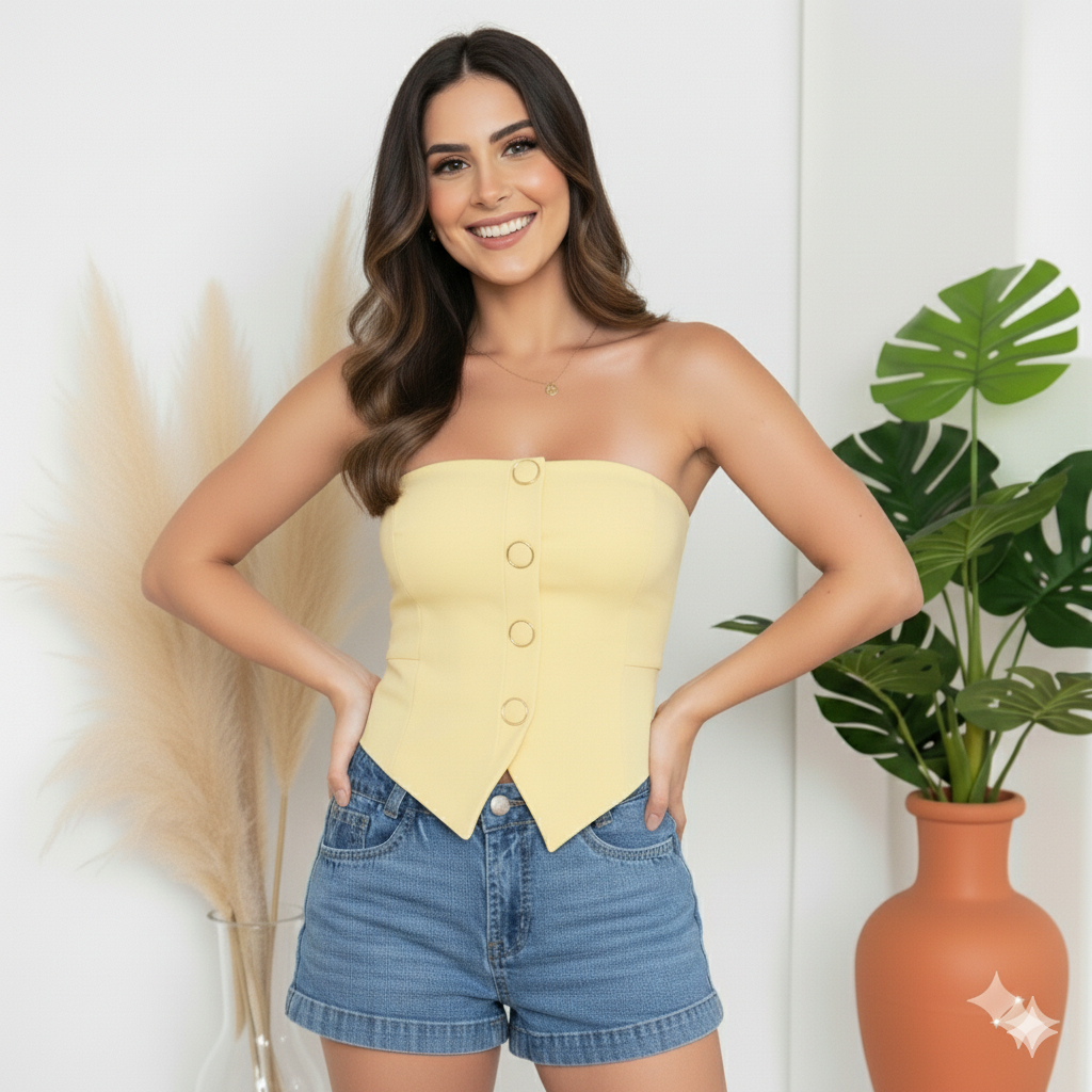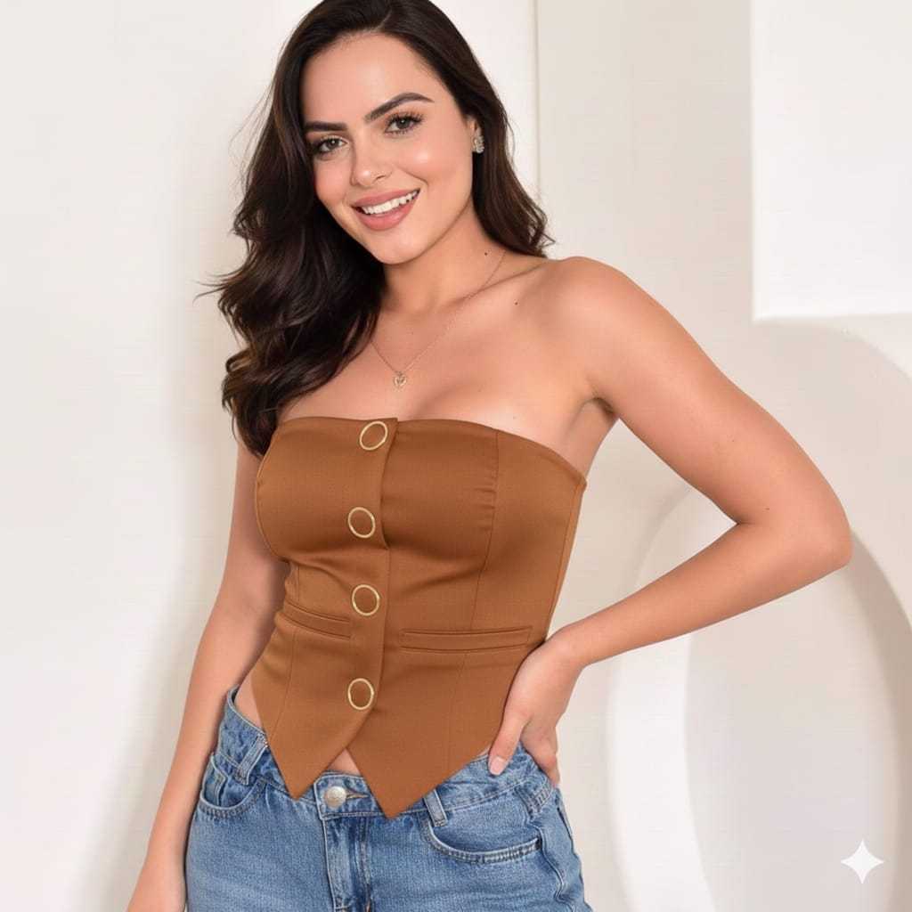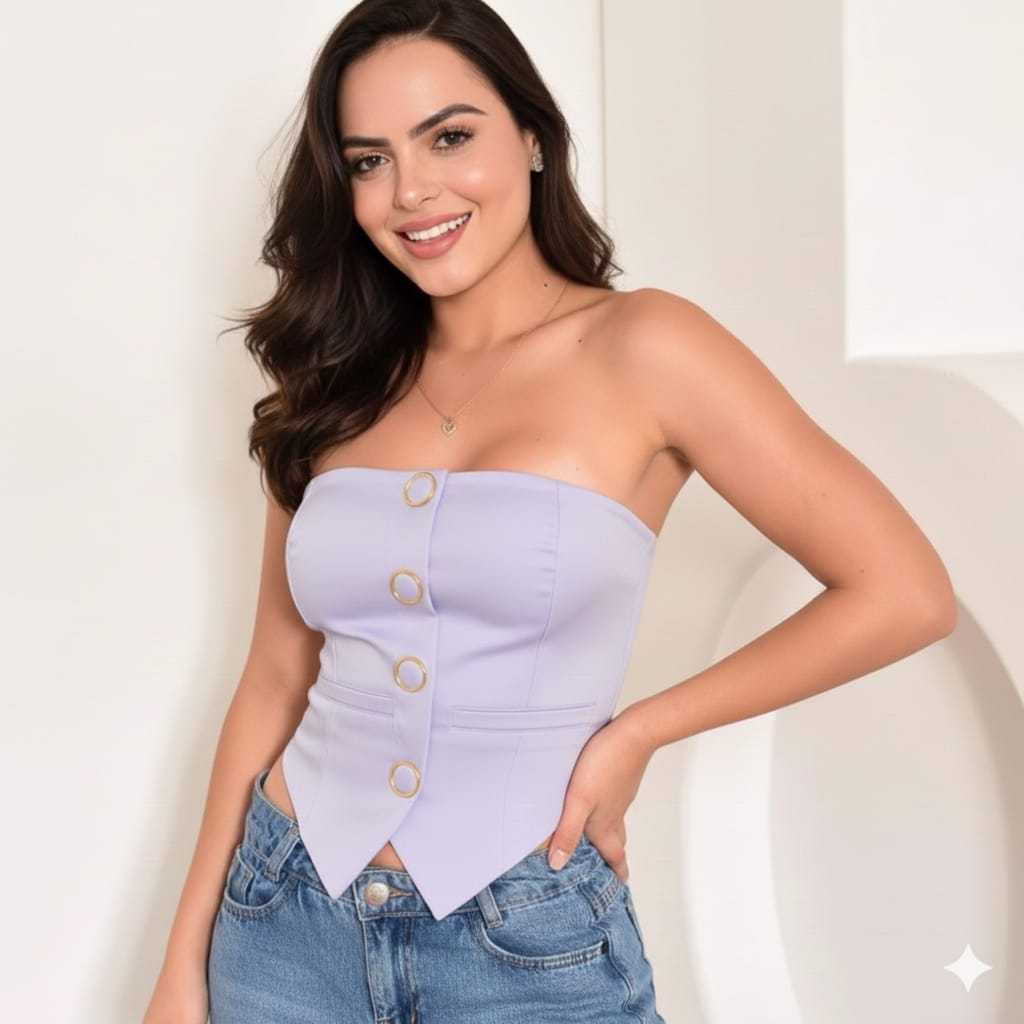 TOP CROPPED FEMININO EM ALFAIATARIA TOMARA QUE CAIA COM LASTEX