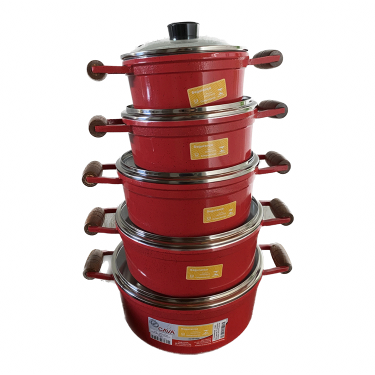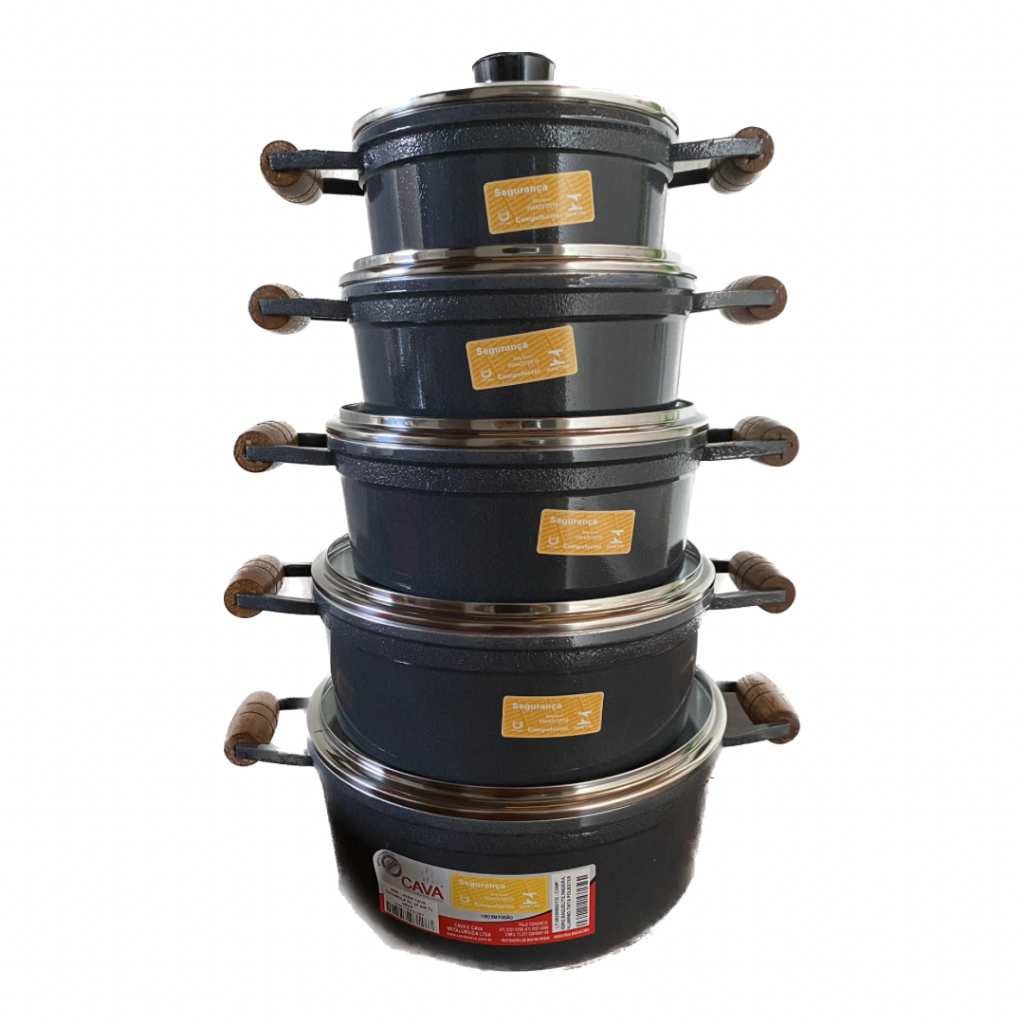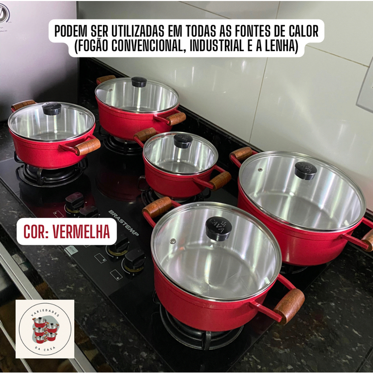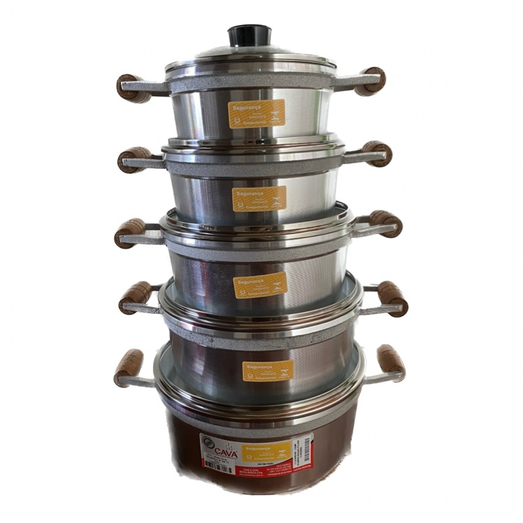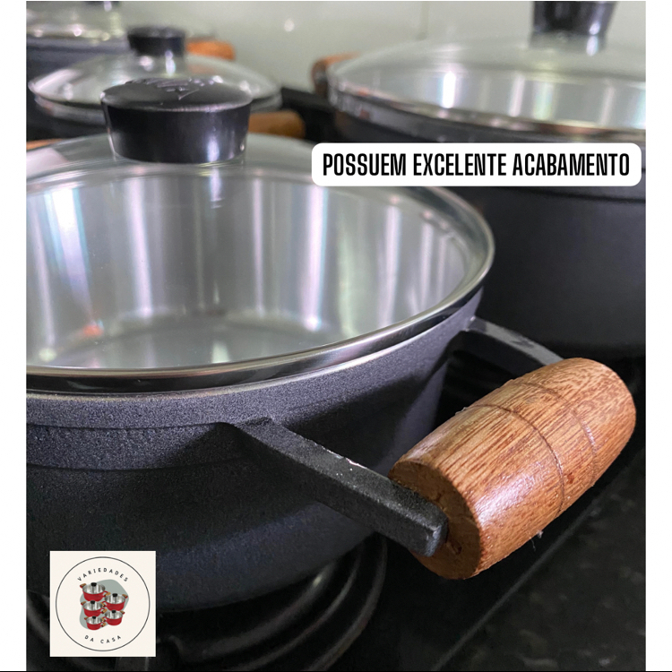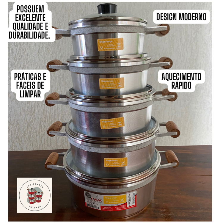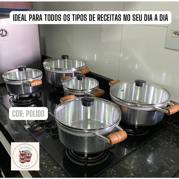 kit Jogo de Panela Cava com 5 Peças de Alumínio grosso, Alça de Madeira e Tampa de vidro temperado
