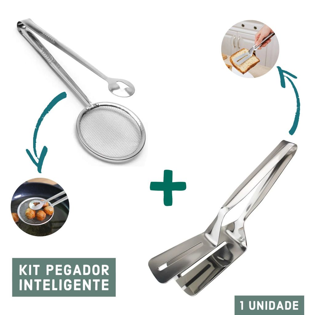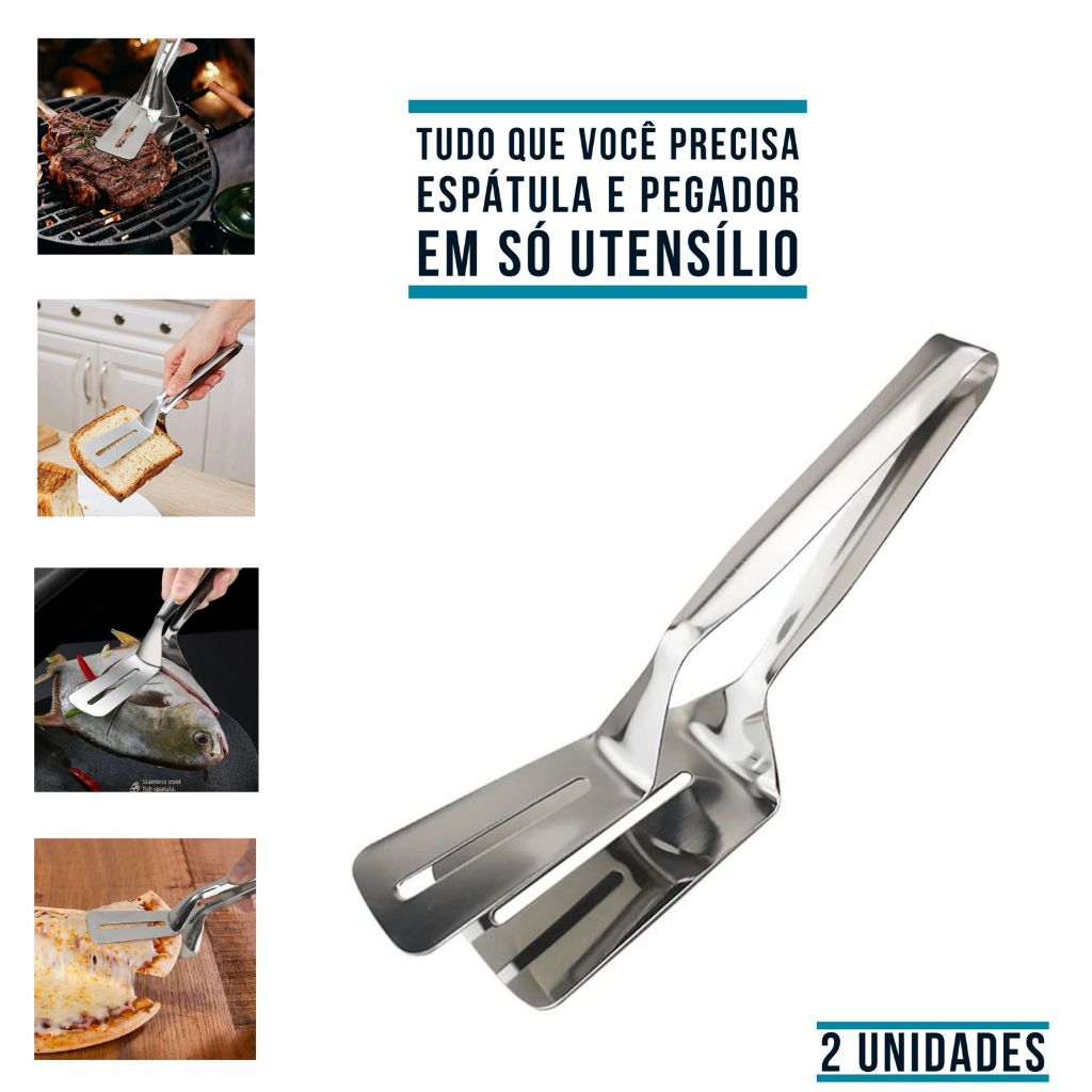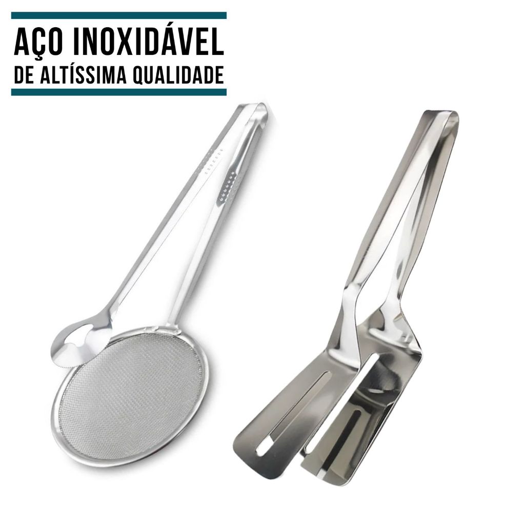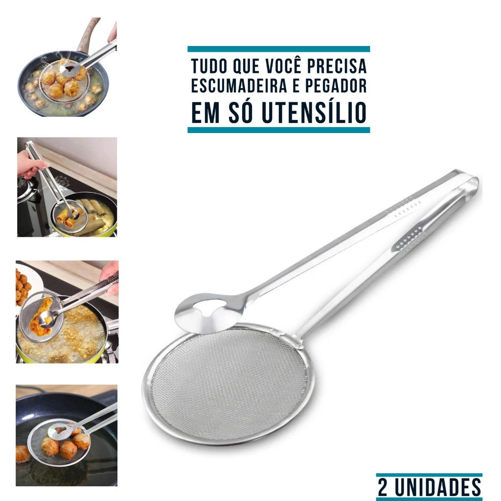 Pegador Inox Fritura Escumadeira Pinça Peneira ou Espátula Dupla Para Carne Ovo Pizza Cozinha