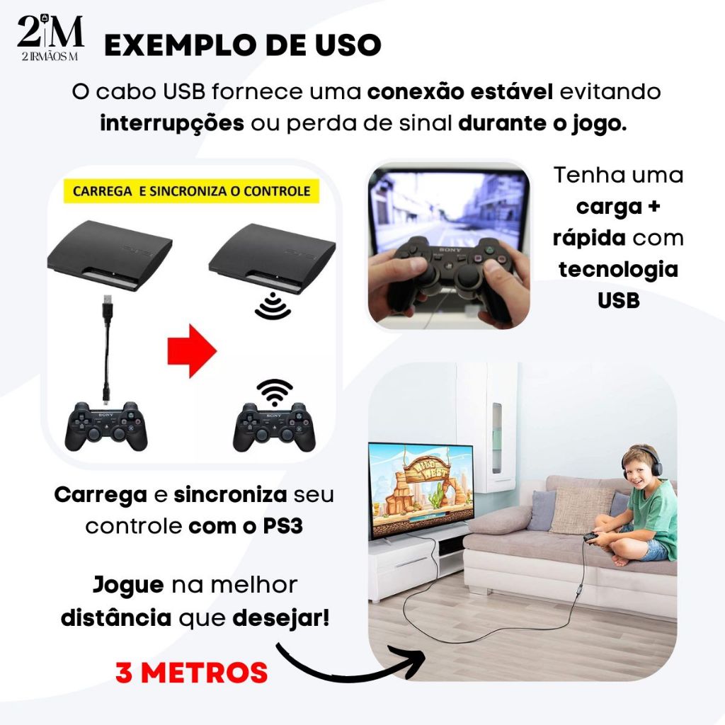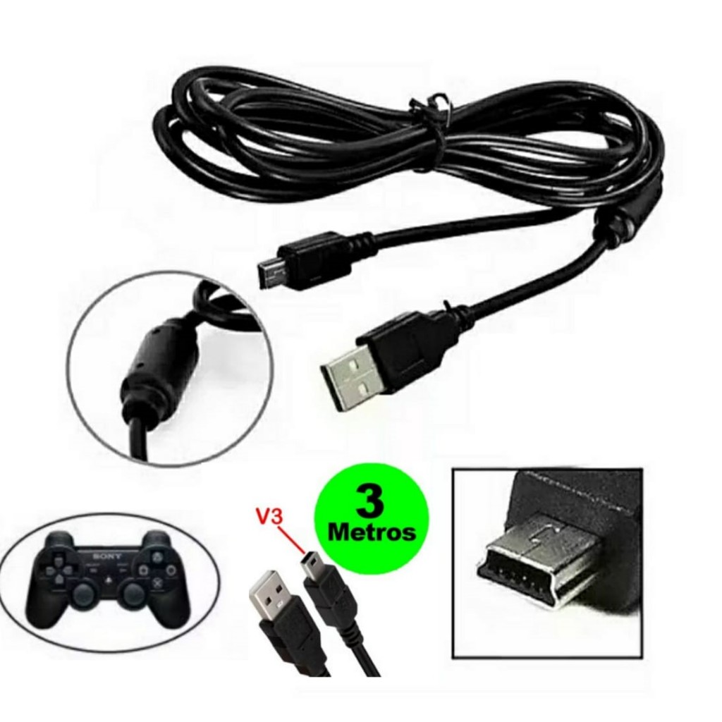 Cabo Controle Ps3 V3 Usb 3 METROS Grande Turbo Reforçado Carrega e Joga Com Filtro USB Resistente