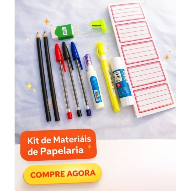 Kit Material Escolar 11 itens: 02 Lápis Preto 3 Canetas Borracha Apontador Marca Texto Caneta Corret Etiqueta Cola