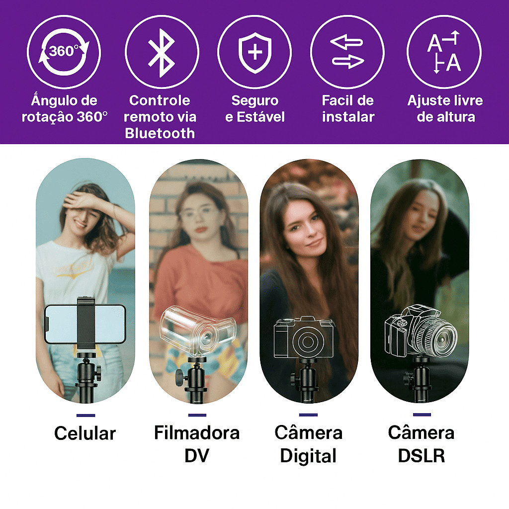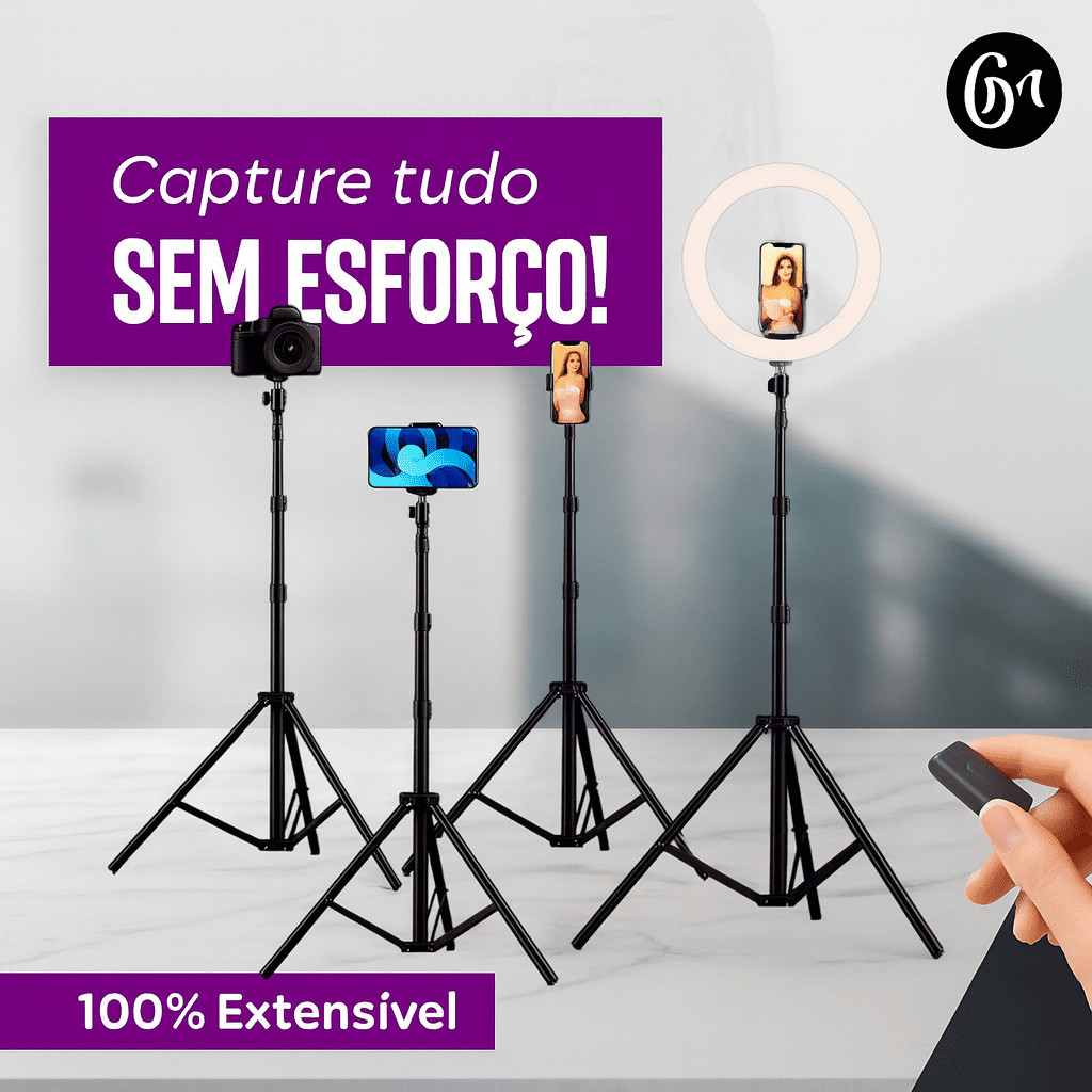 Tripé Universal 2.10m p/ Celular Câmera Altura Ajustável Leve e Resistente para Gravações Articulado