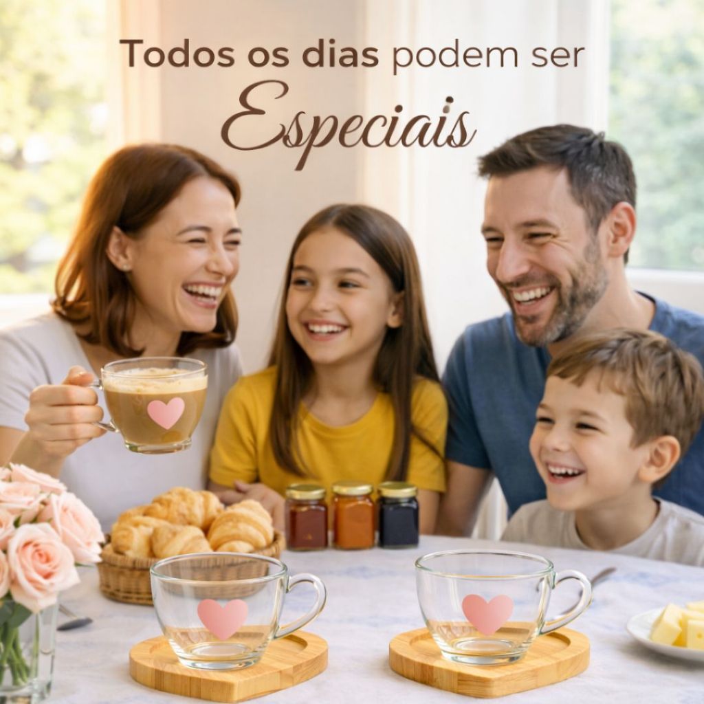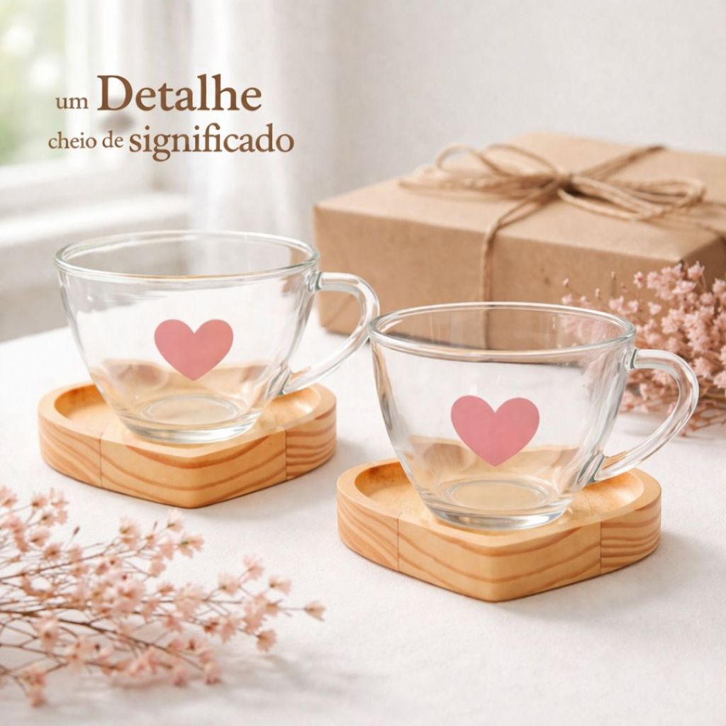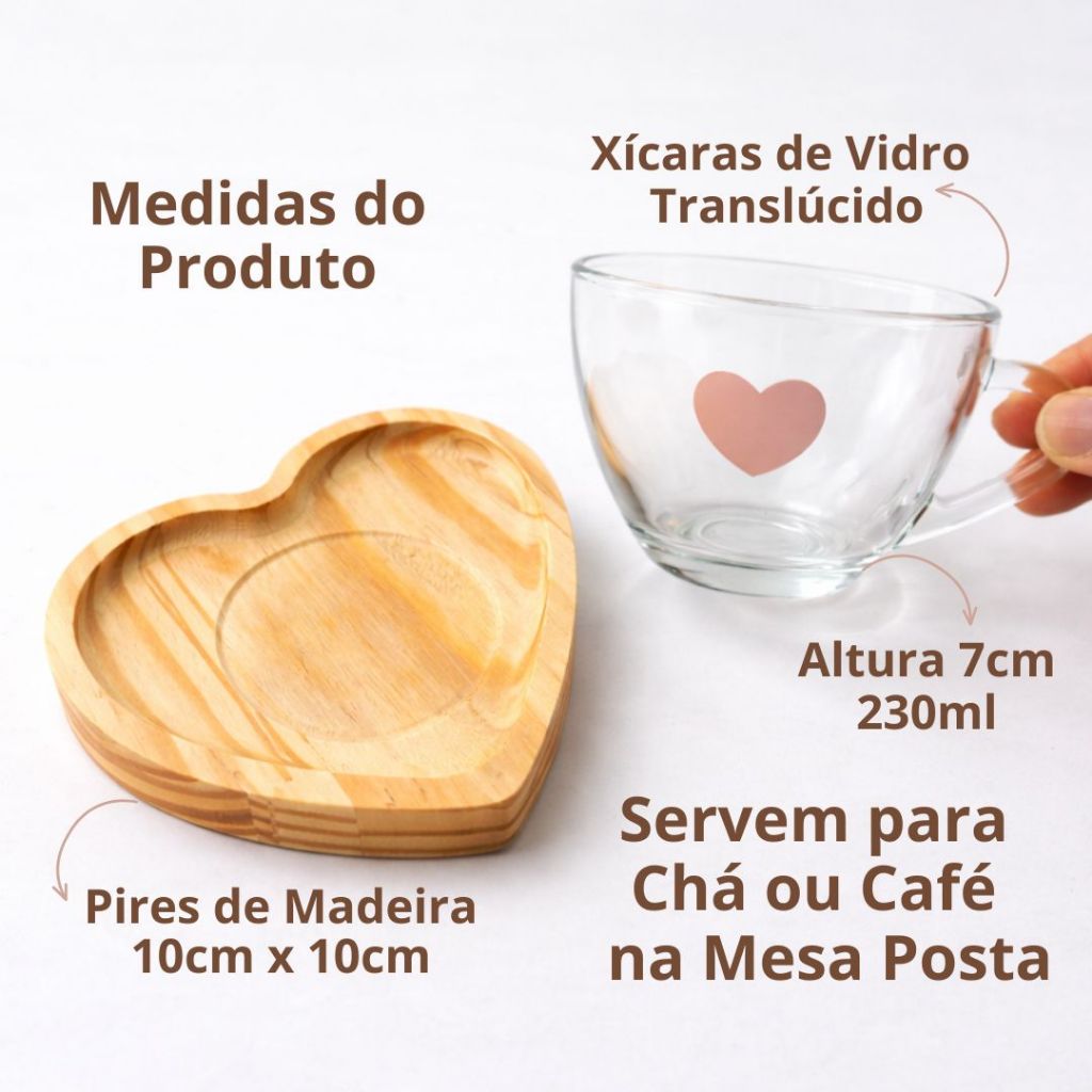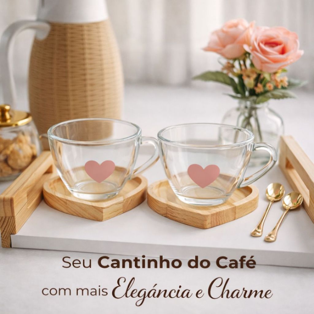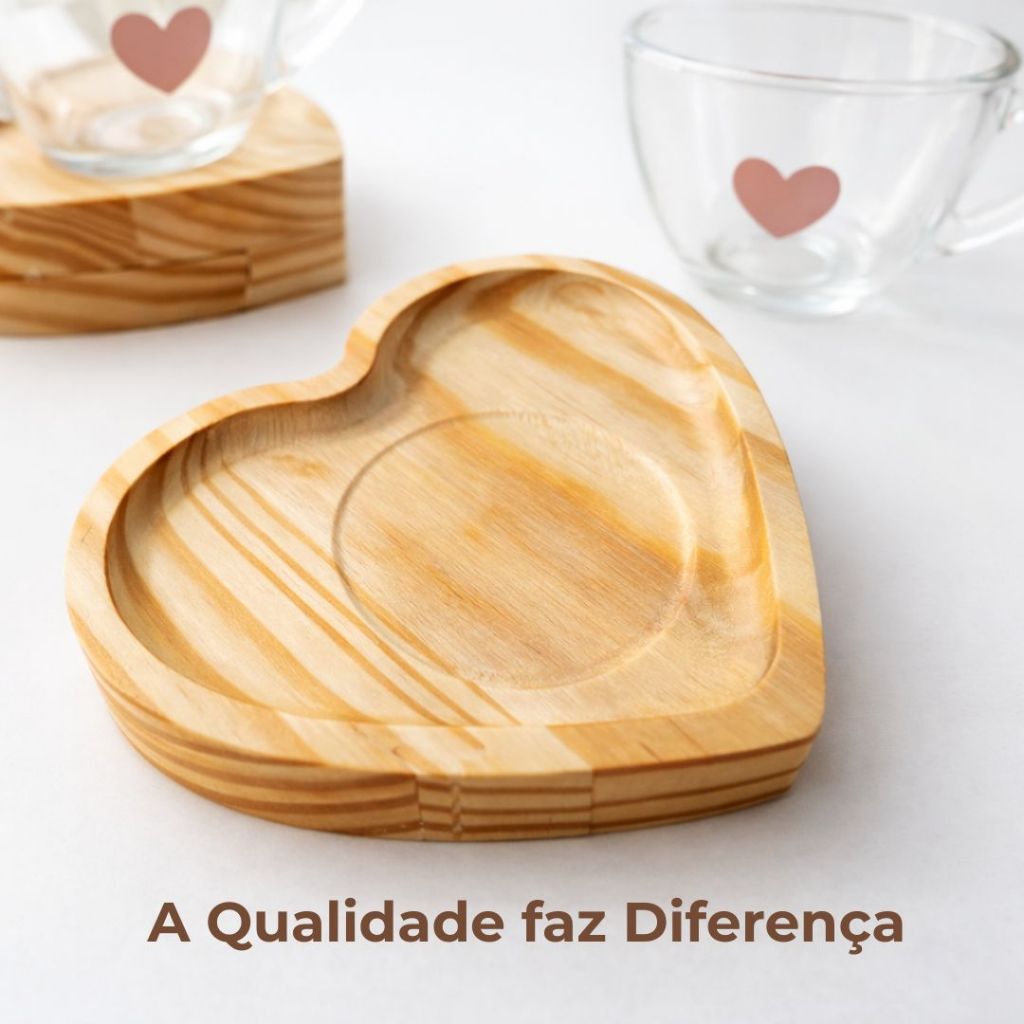 Jogo Xícaras Café Chá Pires Madeira Coração Rosa Presente Dia das Mães Mesa Posta Cantinho do Café