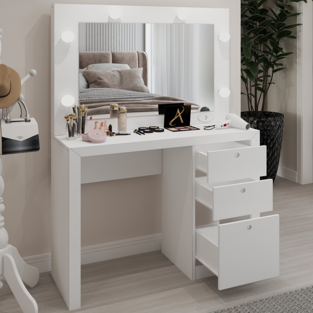 Penteadeira Camarim 3 Gavetas Beauty com Espelho e Bocais para Lâmpada Branco - Panorama Móveis