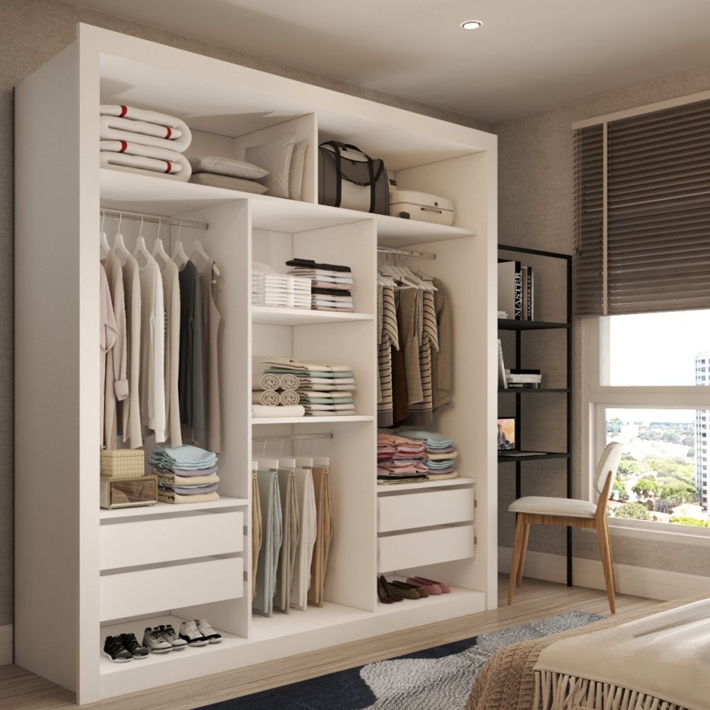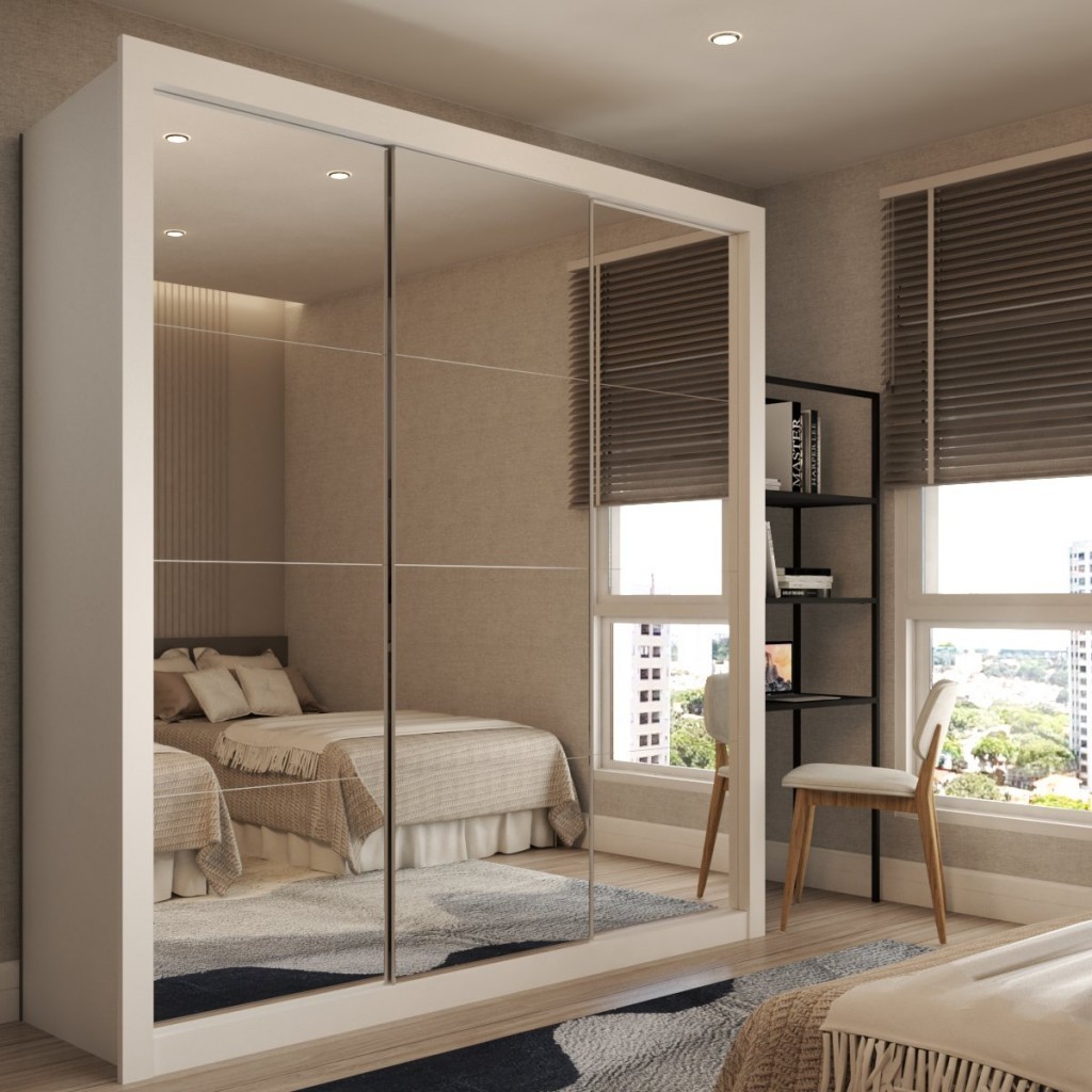 Guarda-Roupa Casal Santos 3 Portas de Correr 4 Gavetas Espelhado Branco - Panorama Móveis