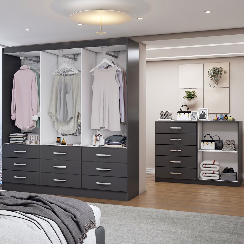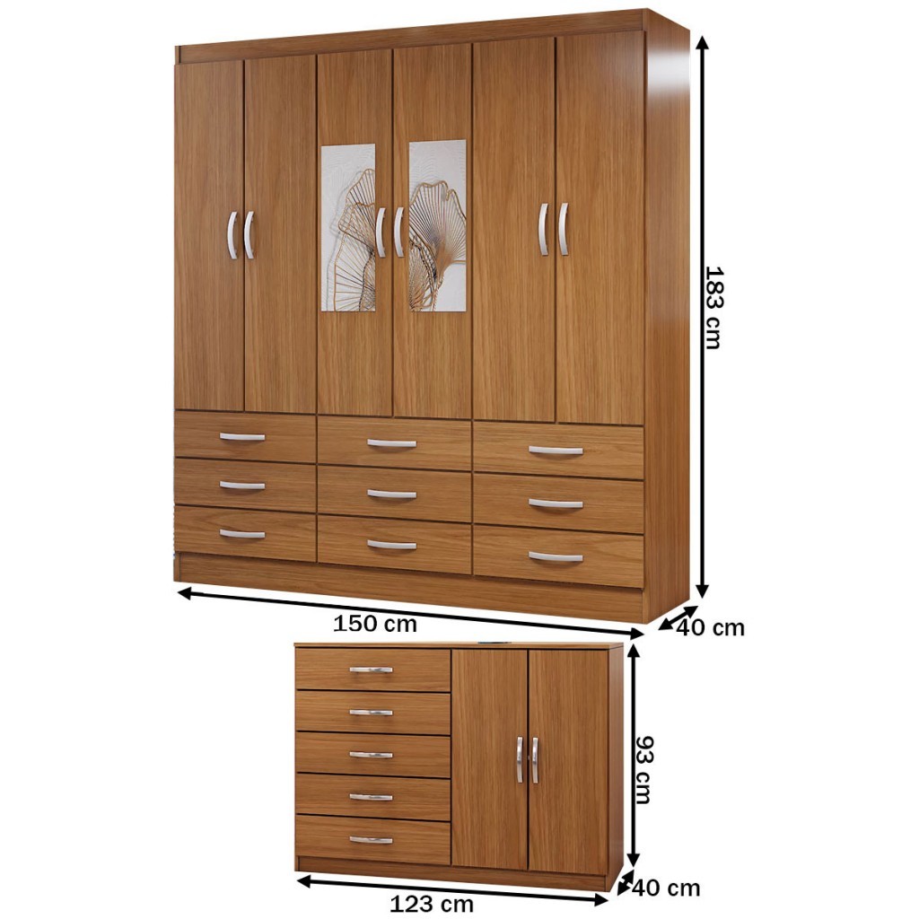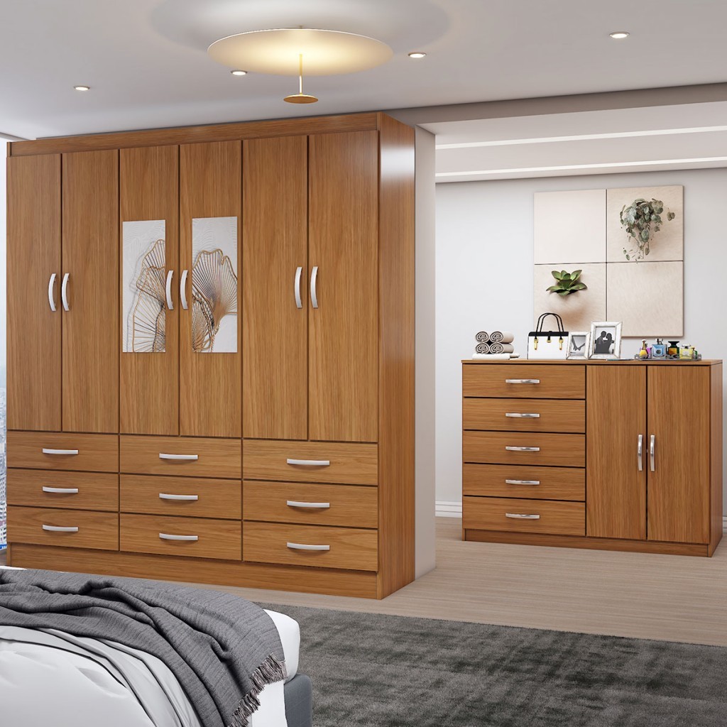 Guarda-Roupa Casal Iris 6 Portas 9 Gavetas e Espelho com Cômoda 2 Portas 5 Gavetas