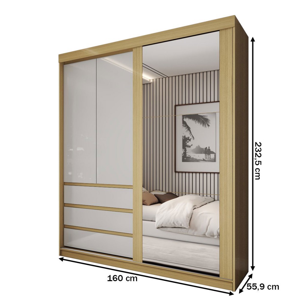 Guarda-Roupa Solteiro Rosário 100% Mdf 3 Portas 3 Gavetas com Espelho Castanho/Off White - Panorama Móveis