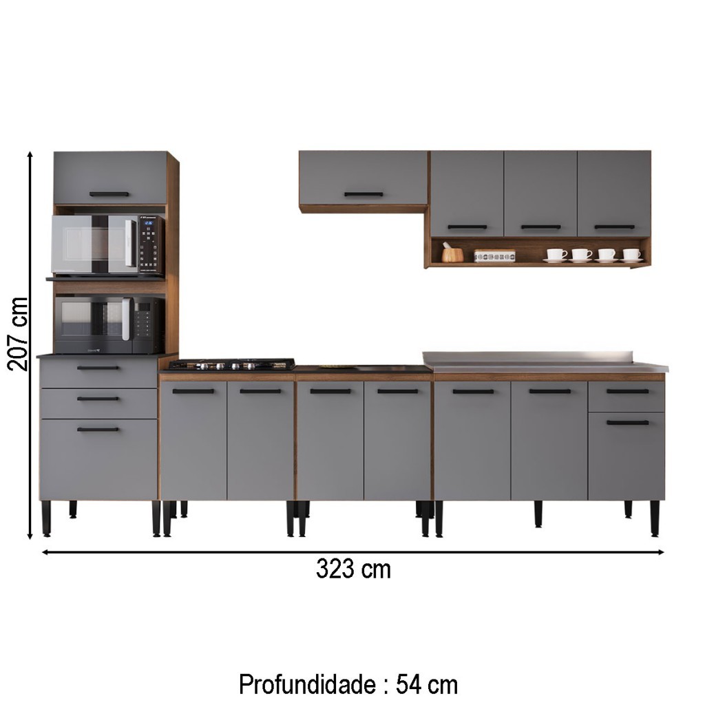 Armário de Cozinha Amanda 13 Portas 3 Gaveta Freijó/Cinza - Pnr Móveis