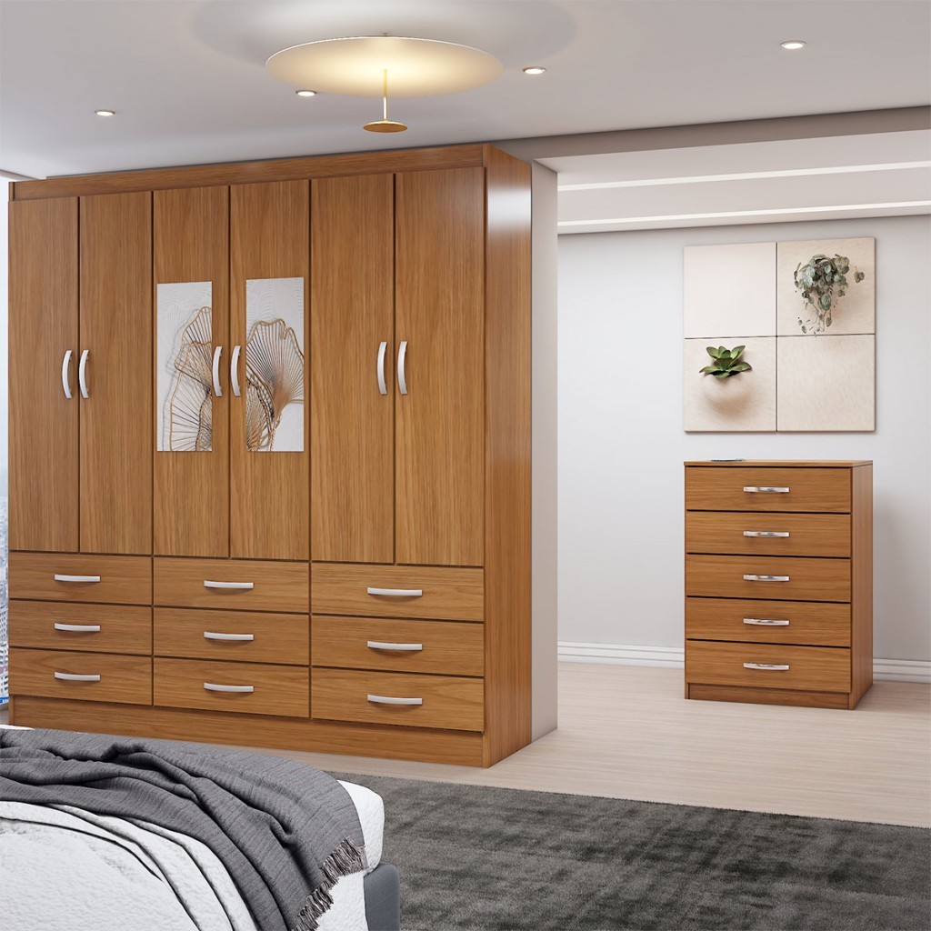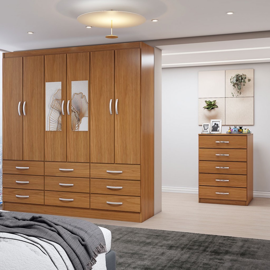 Guarda-Roupa Casal Vivian 6 Potas 9 Gavetas e Espelho com Cômoda 5 Gavetas Cinamomo - Panorama Móveis