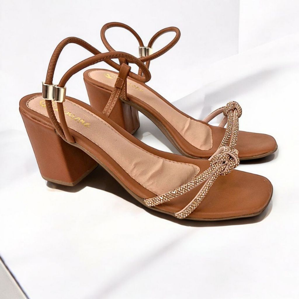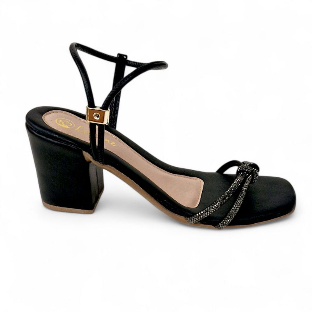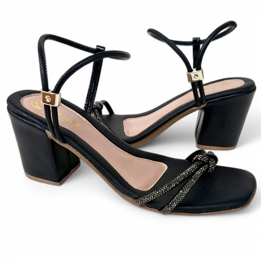 Sandália Salto Alto Bloco 7cm Feminina Traseiro Regulagem com Nó Strass Cristal