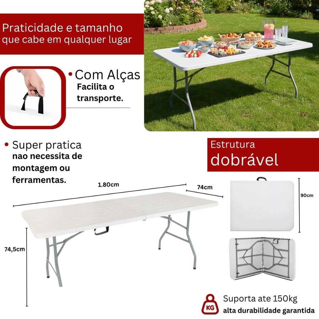 Mesa Dobrável Portátil 1,80 x 90cm Vira Maleta Com Alça Resistente