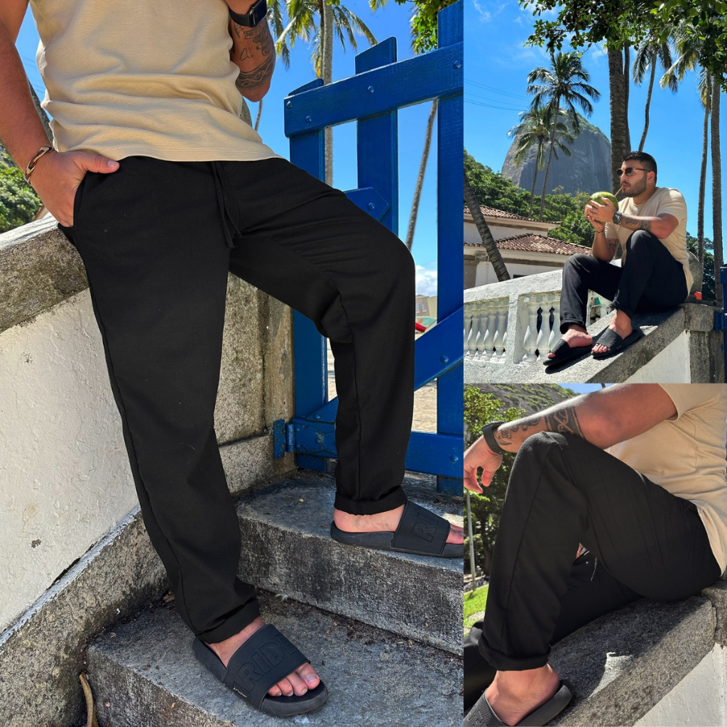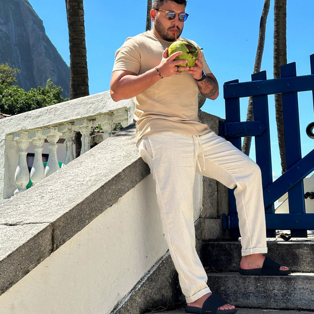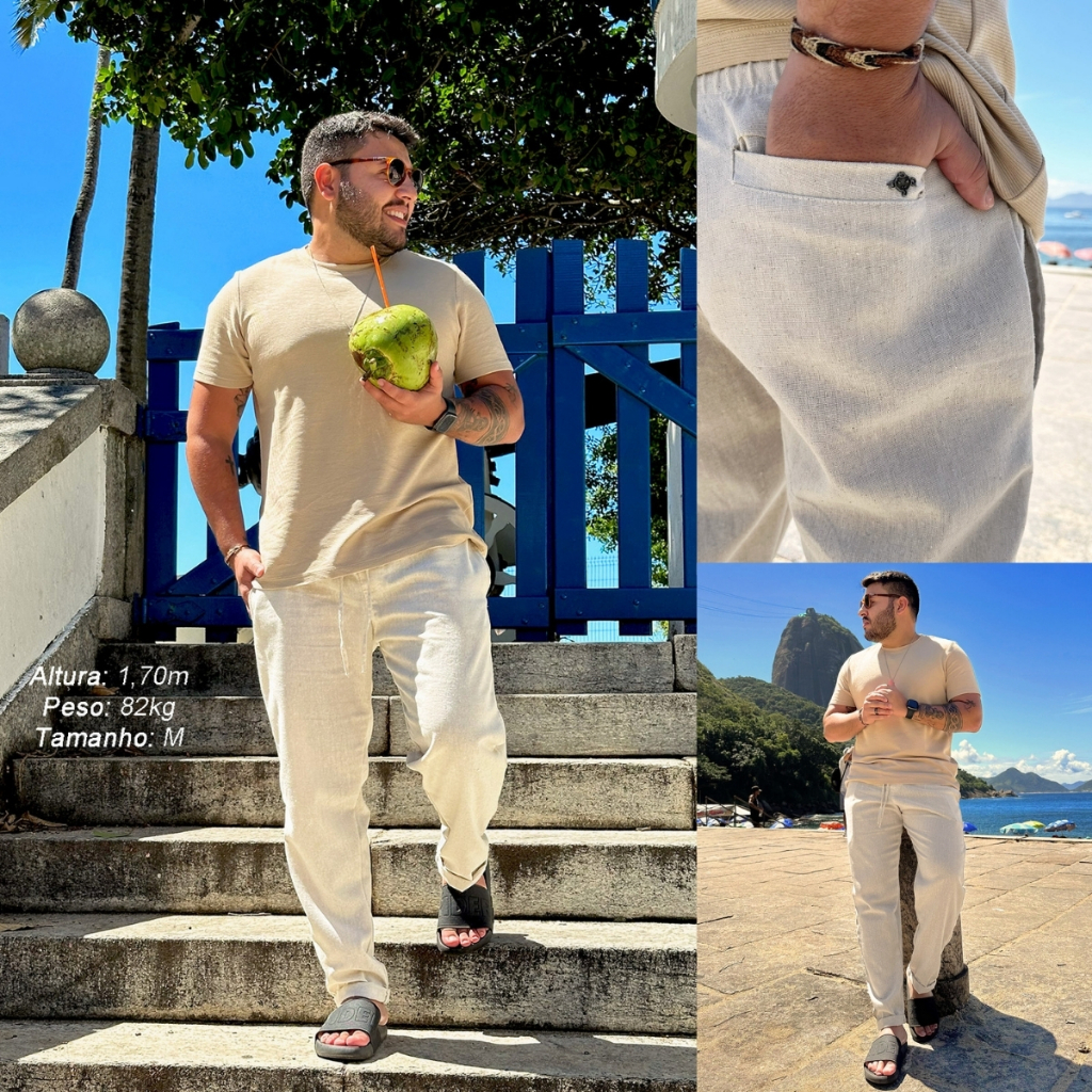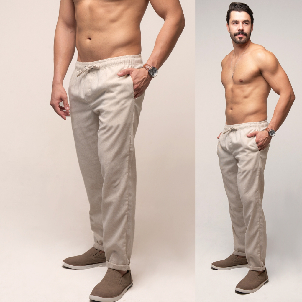 Calça De Linho Masculina Rústica Leve Bege Praia Cordão Ajustável Premium Verão Estilosa Moderna