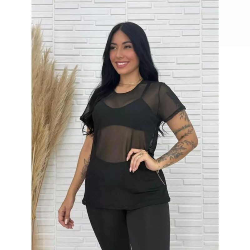 Kit 2 ou 1 Blusa Tule Transparente feminina de academia treino camisa fitness verão