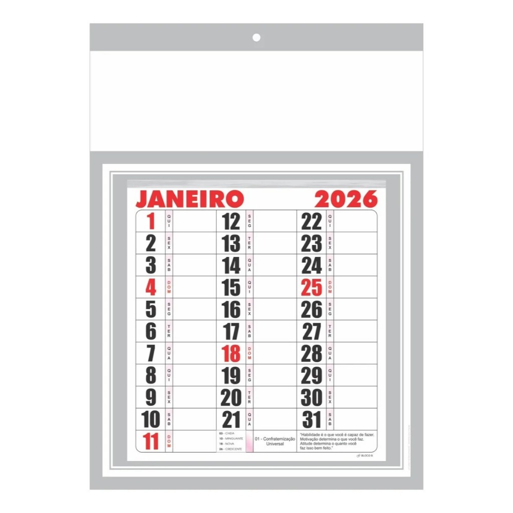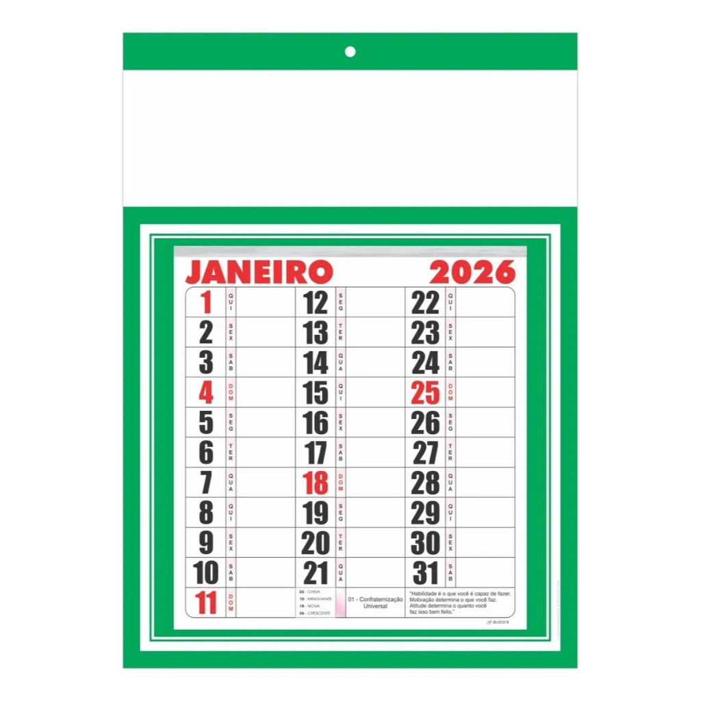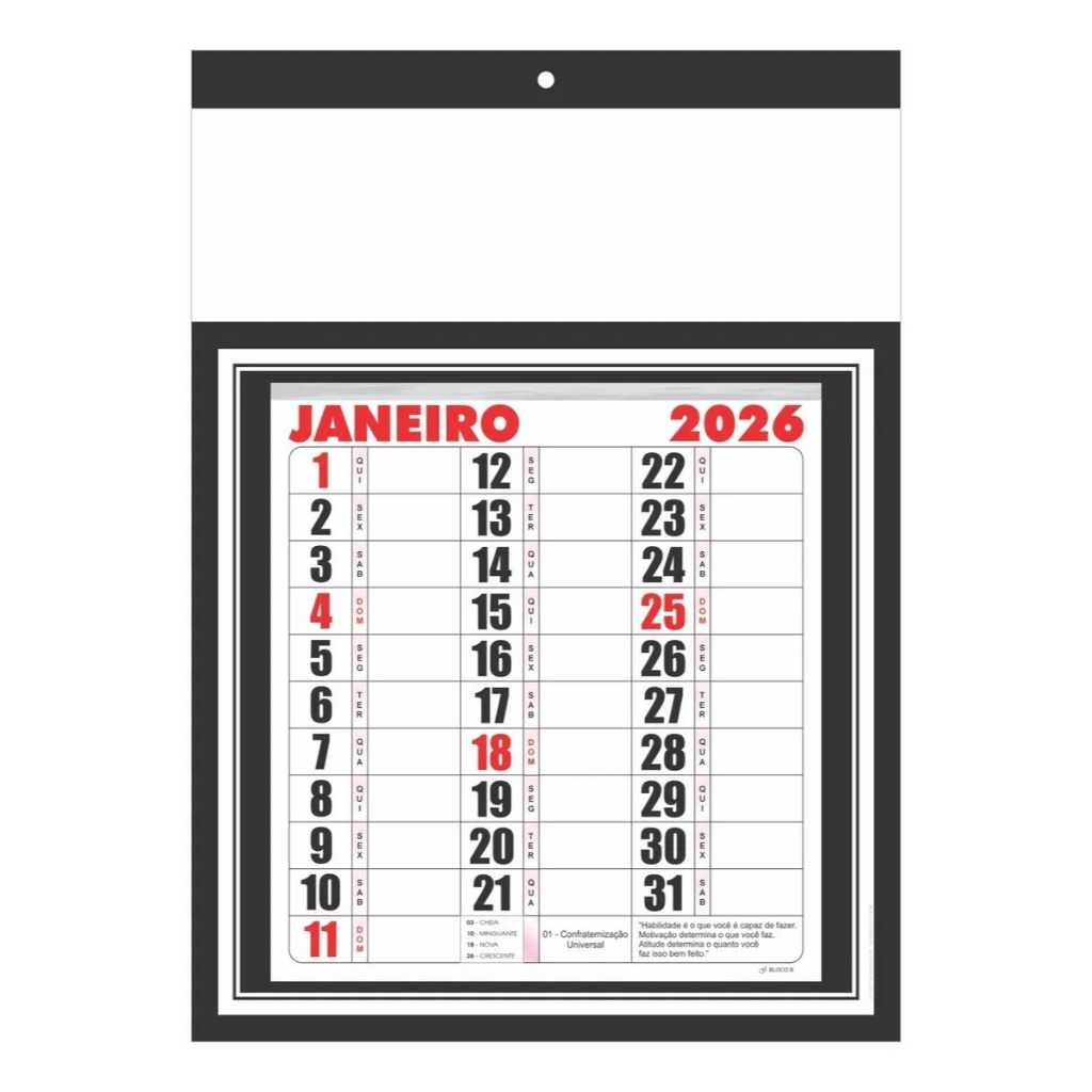 Folhinha calendário cartela bloco B mensal 27x37cm