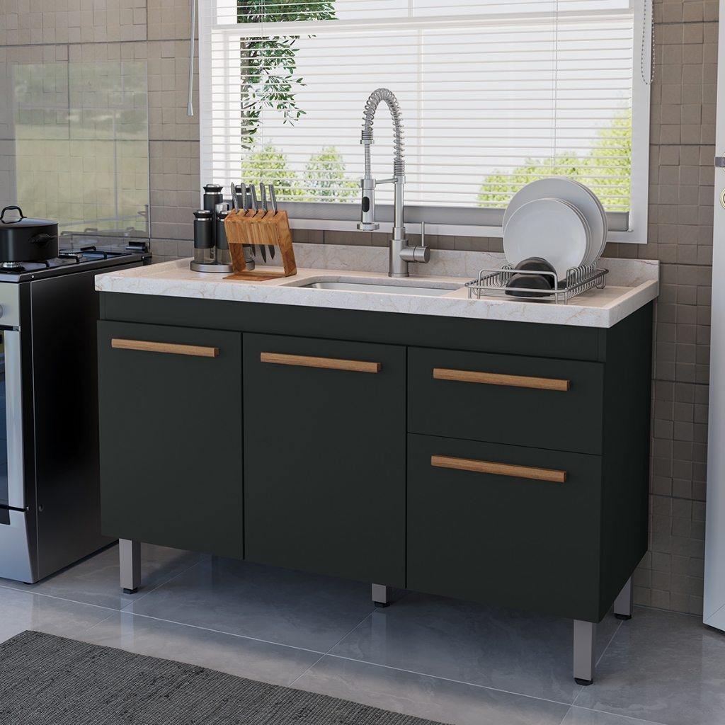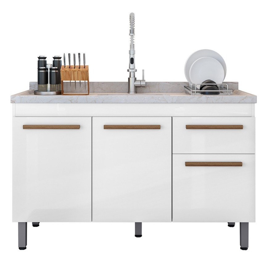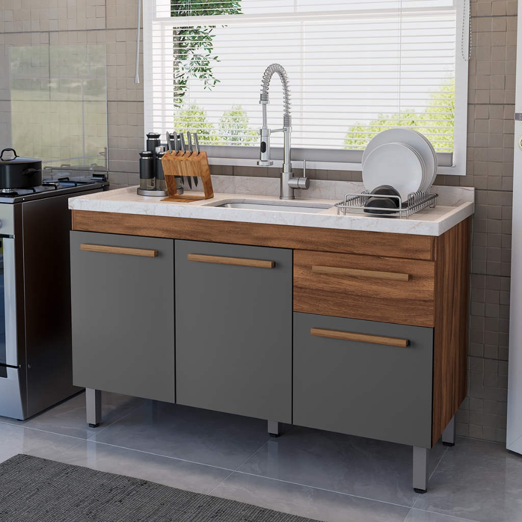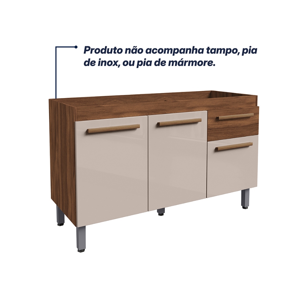 VÁRIAS CORES!! Ajp Móveis Armário Gabinete Balcão Para Pia De 120cm Sem Tampo Olivia 5 Pés Em Pvc 1 Gaveta 3 Portas