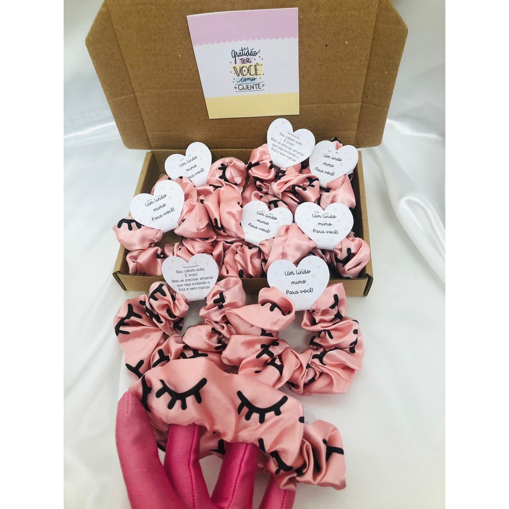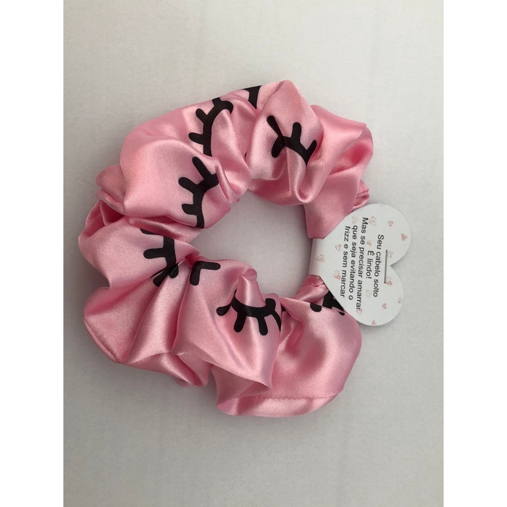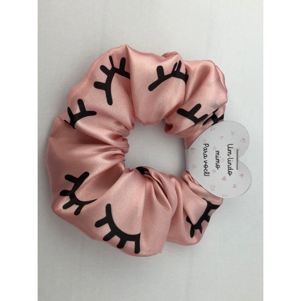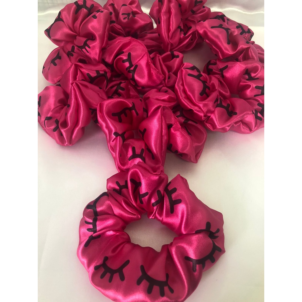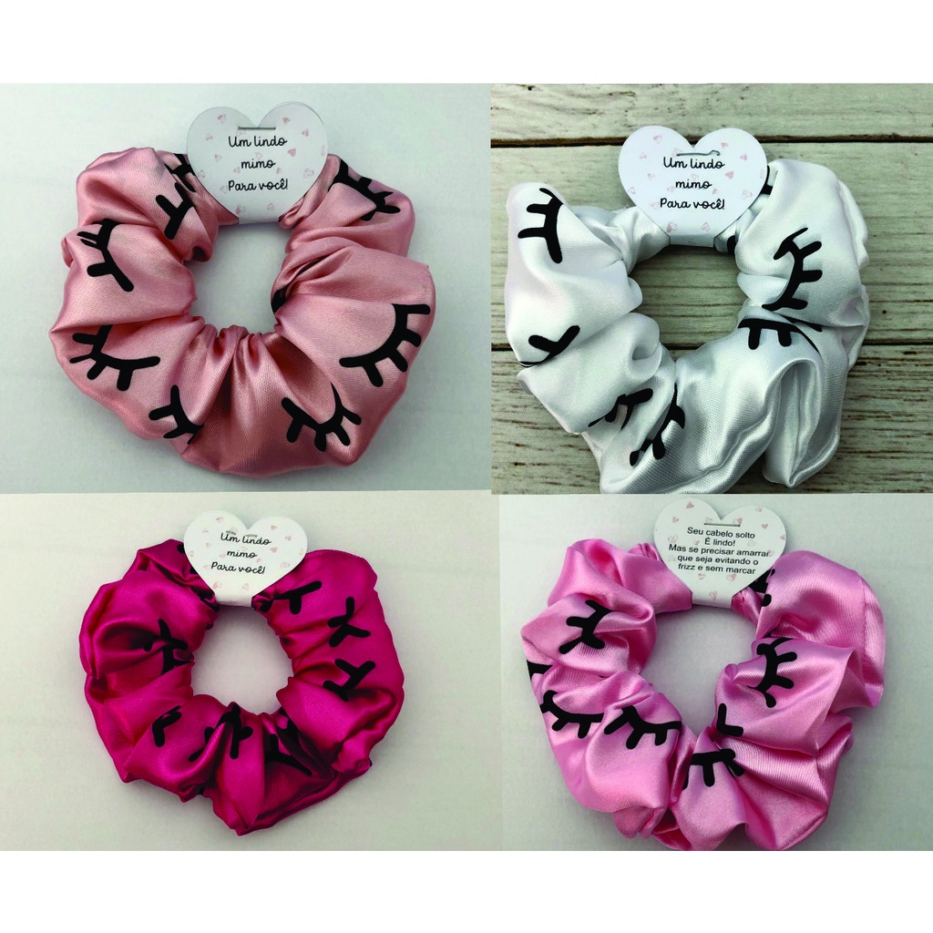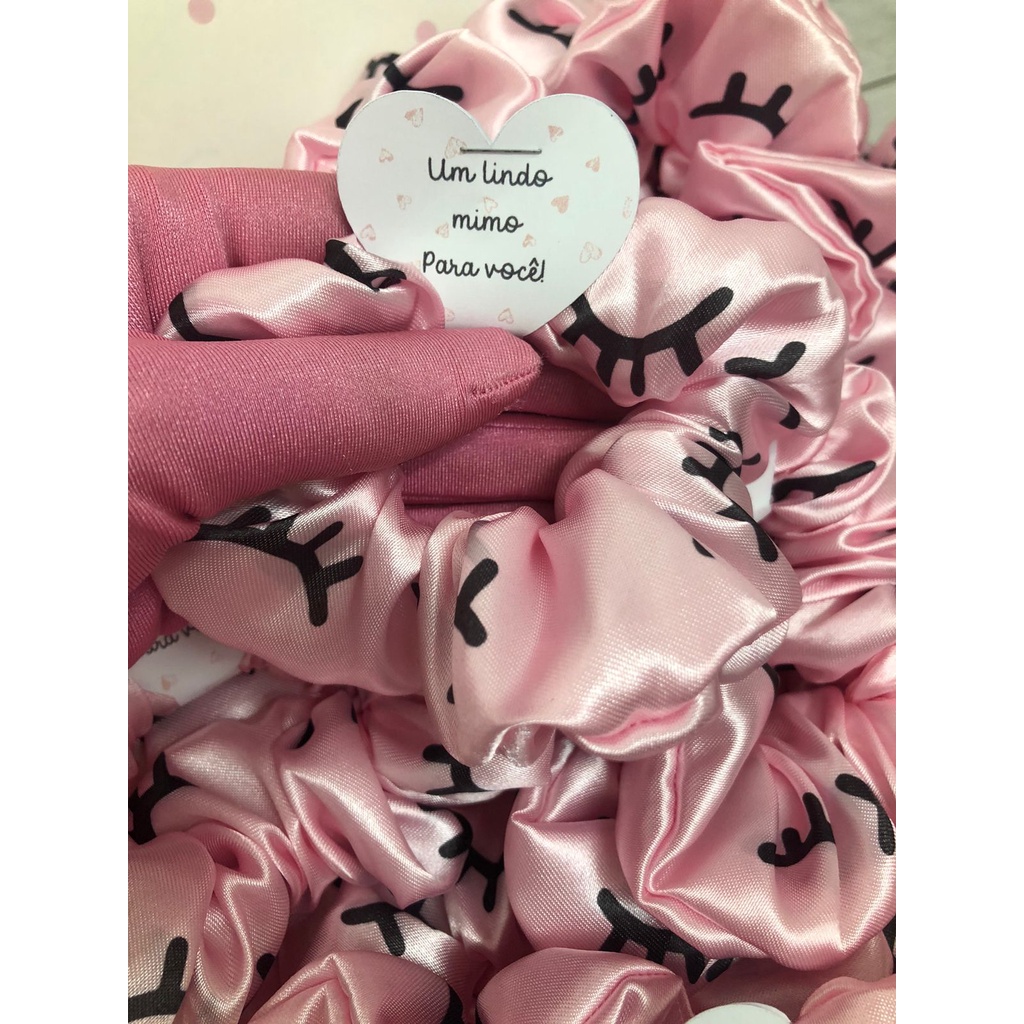Scrunchies - Xuxinhas de cetim lembracinha para cliente com estampa de cílios - Elástico para cabelo com TAG de coração - Mimo cliente - Lembrancinha salão de cabeleireiro, Cílios
