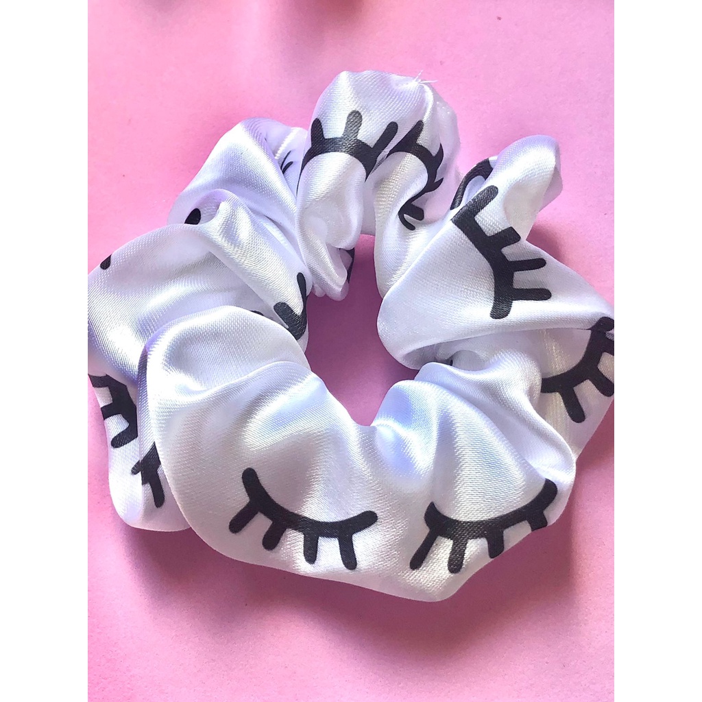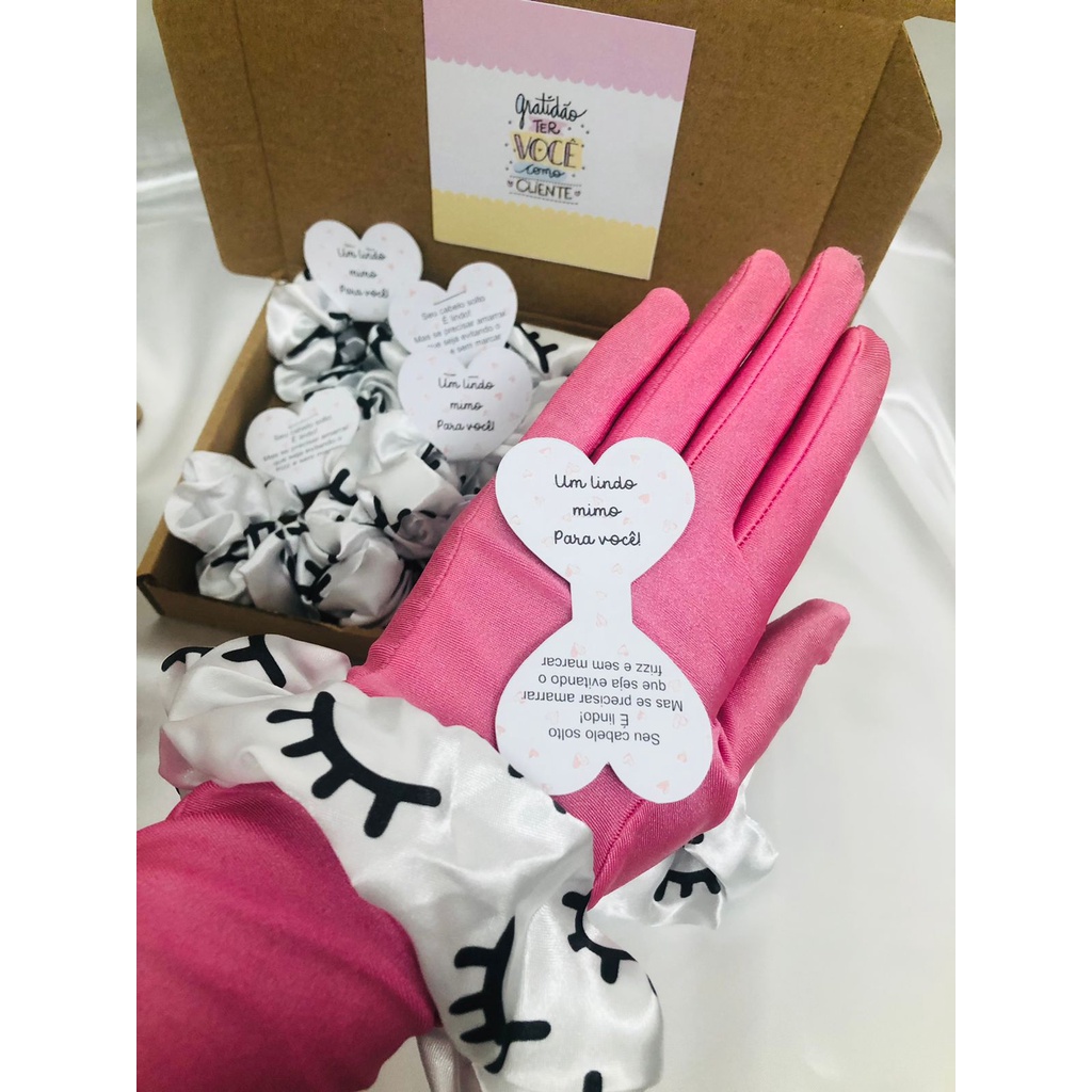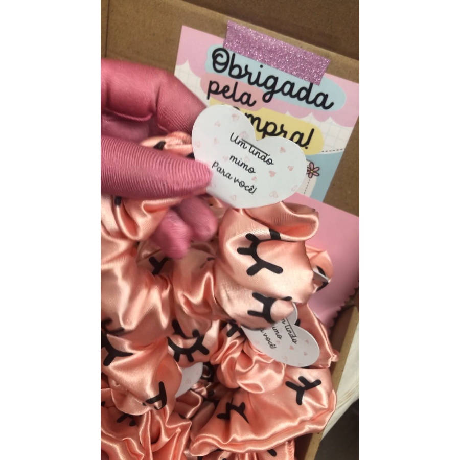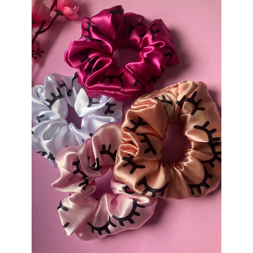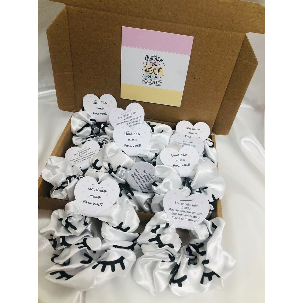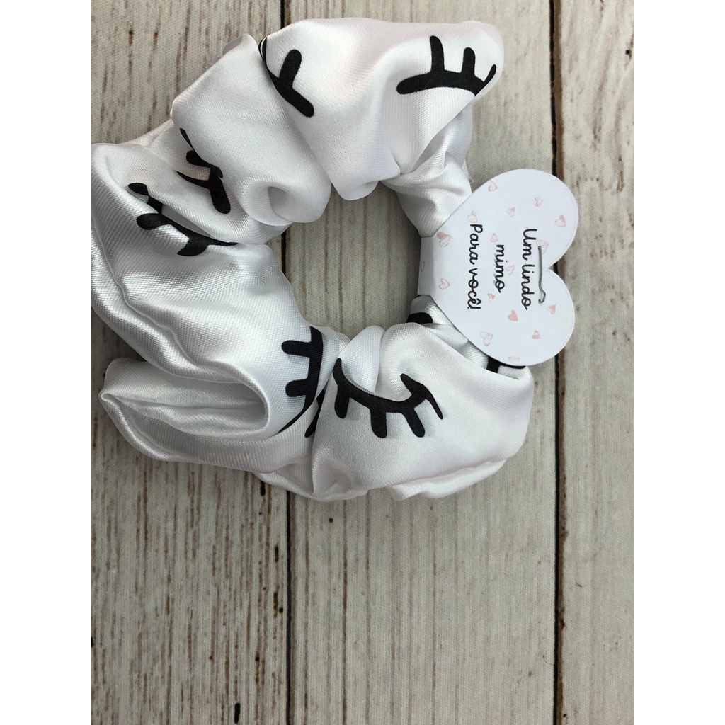 Scrunchies - Xuxinhas de cetim lembracinha para cliente com estampa de cílios - Elástico para cabelo com TAG de coração - Mimo cliente - Lembrancinha salão de cabeleireiro, Cílios