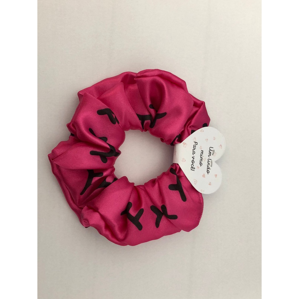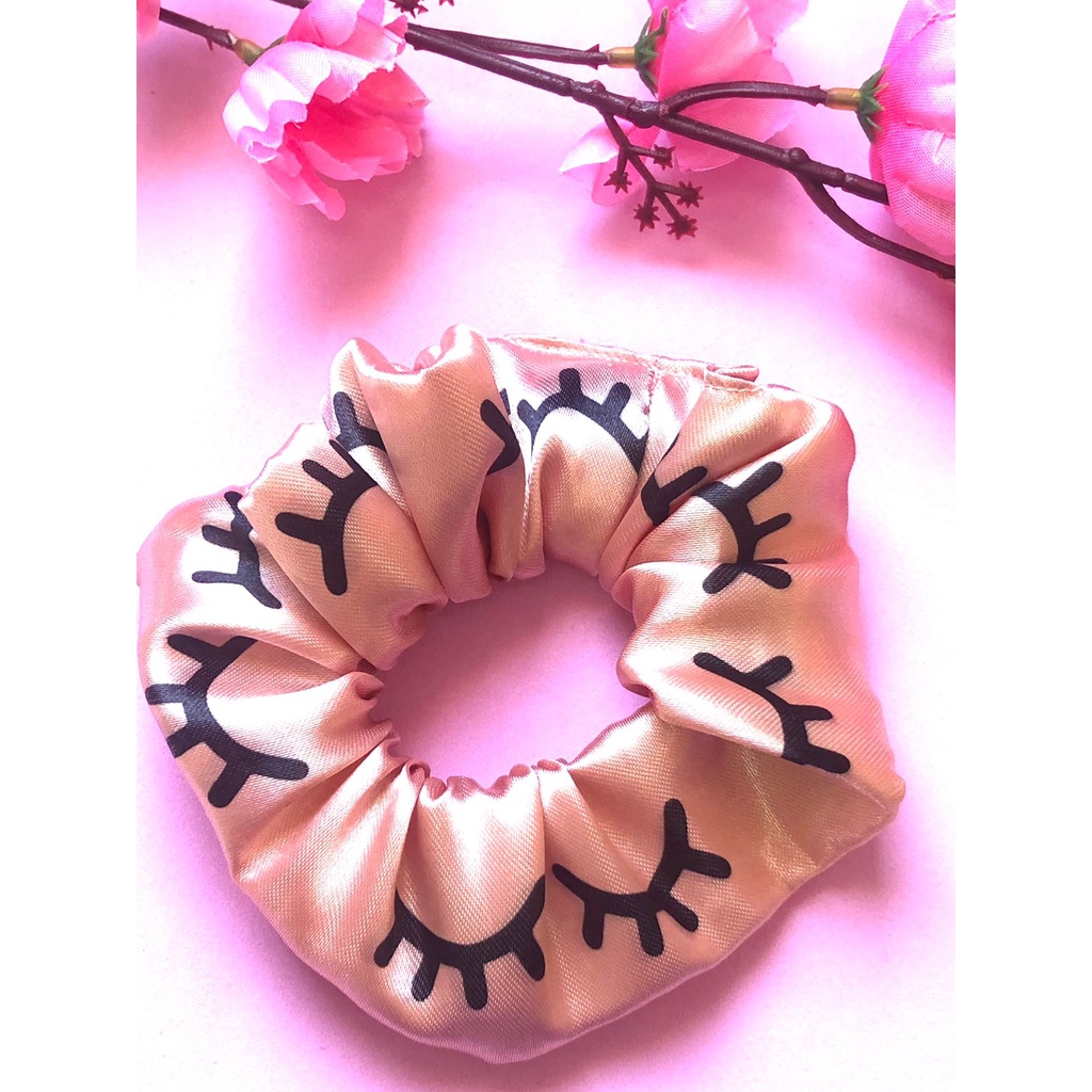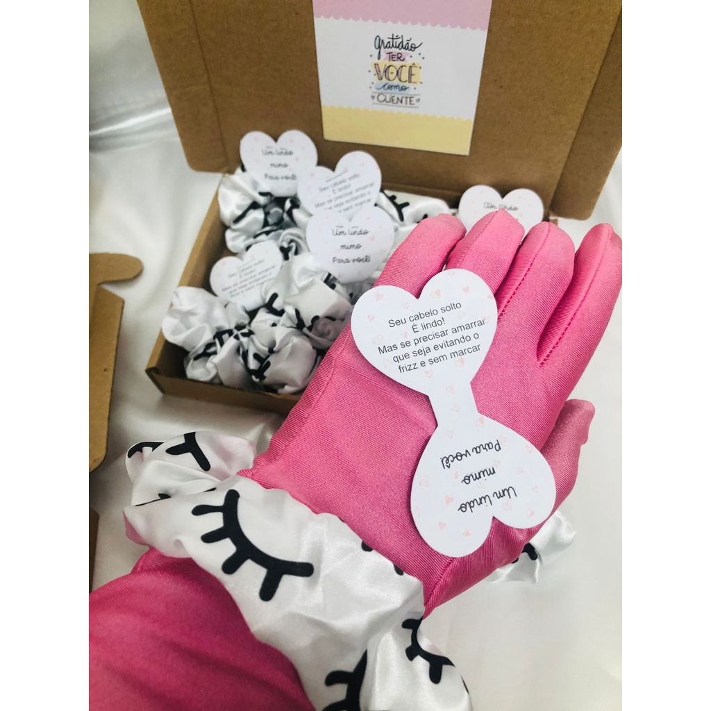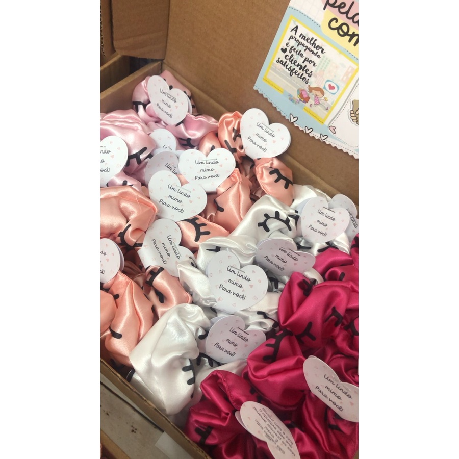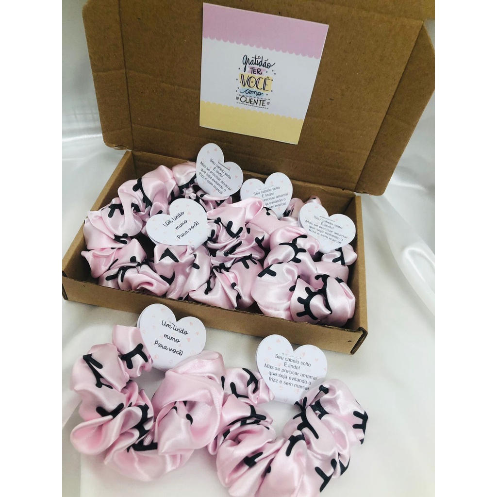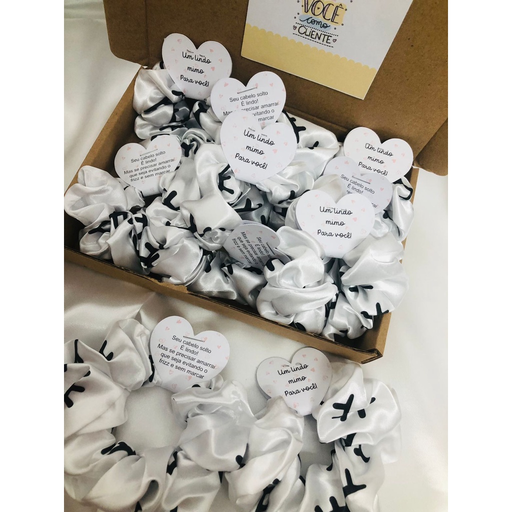 Scrunchies - Xuxinhas de cetim lembracinha para cliente com estampa de cílios - Elástico para cabelo com TAG de coração - Mimo cliente - Lembrancinha salão de cabeleireiro, Cílios