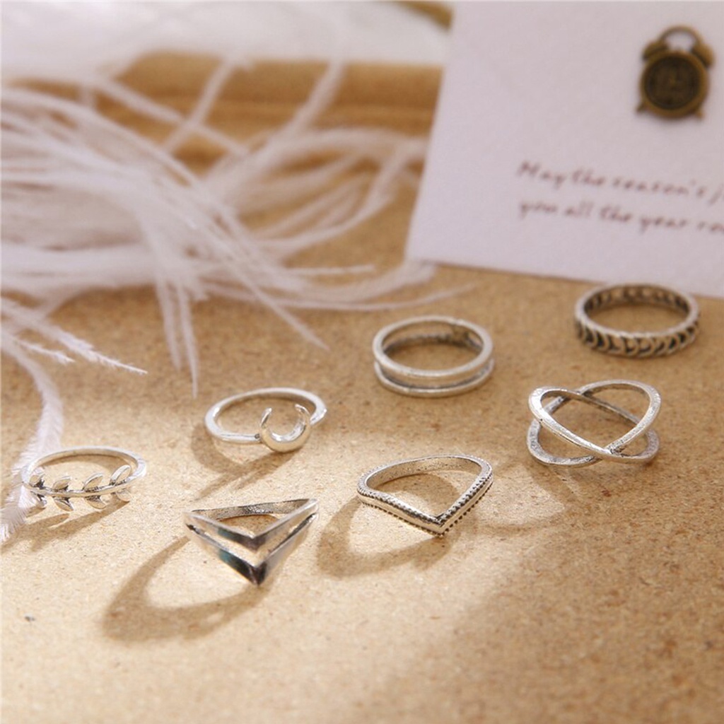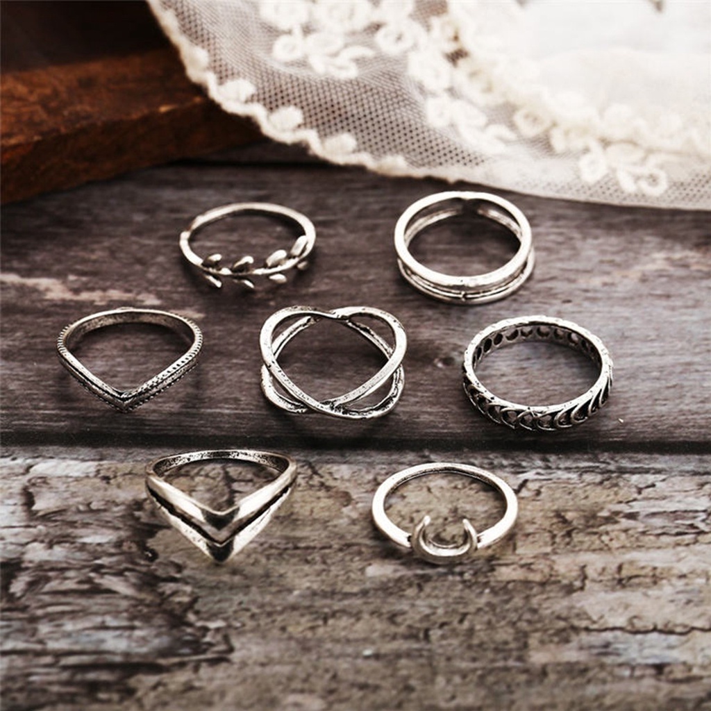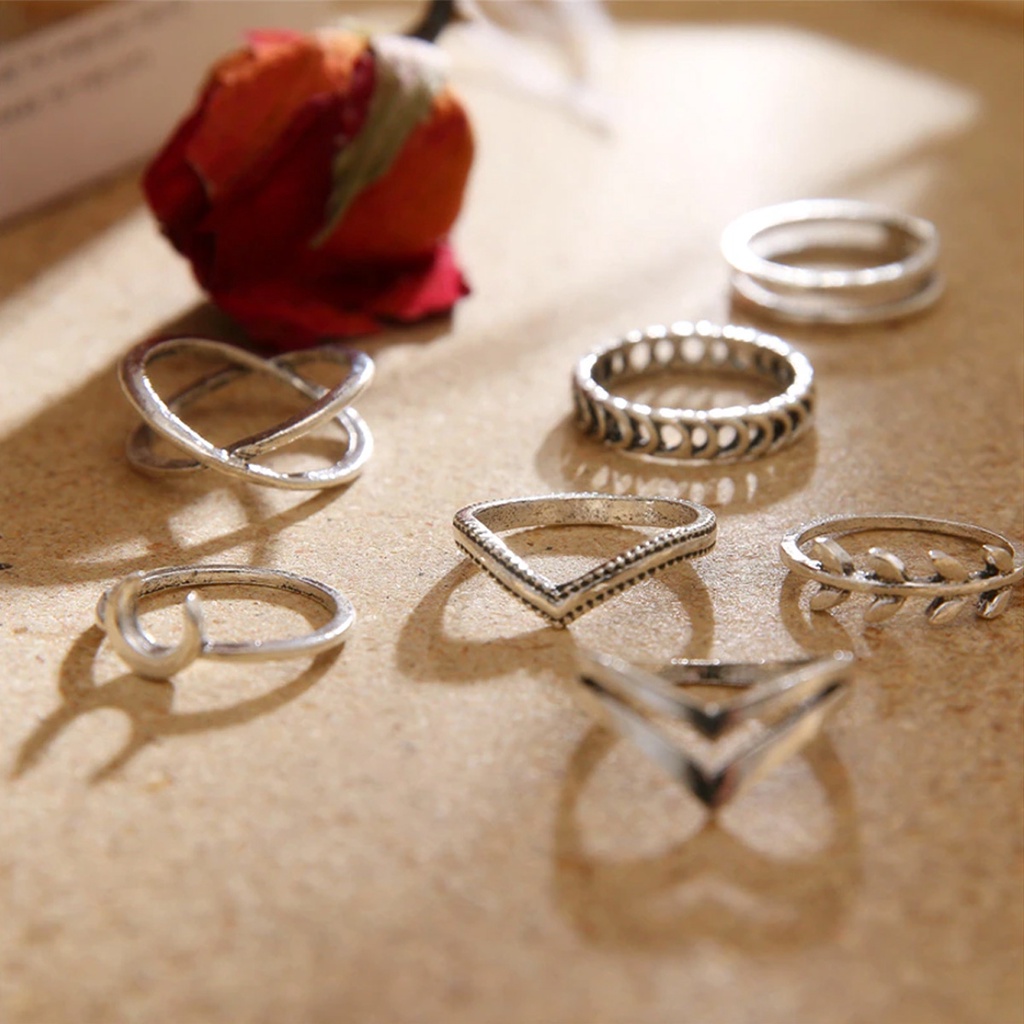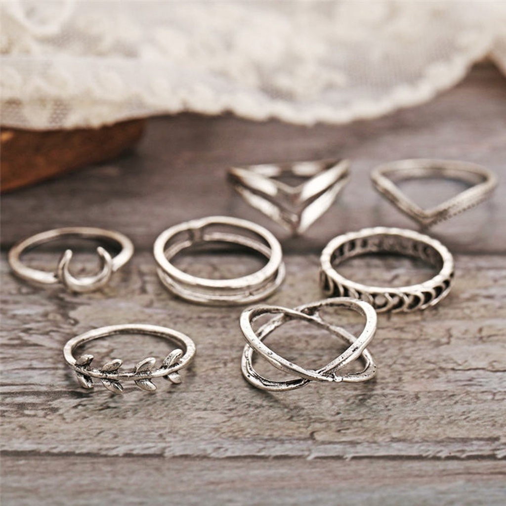 7 Anéis Falange Lua Folhas Detalhes Sorte Harmonia Minimalista