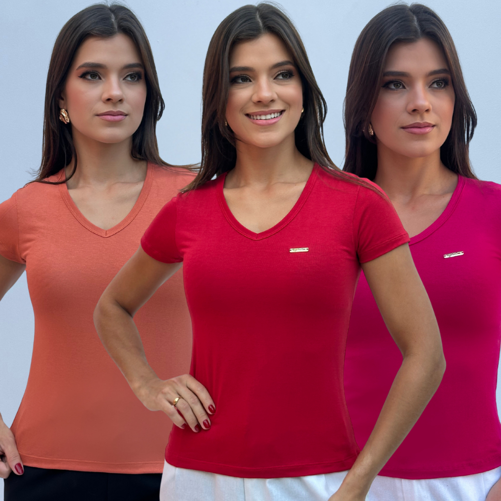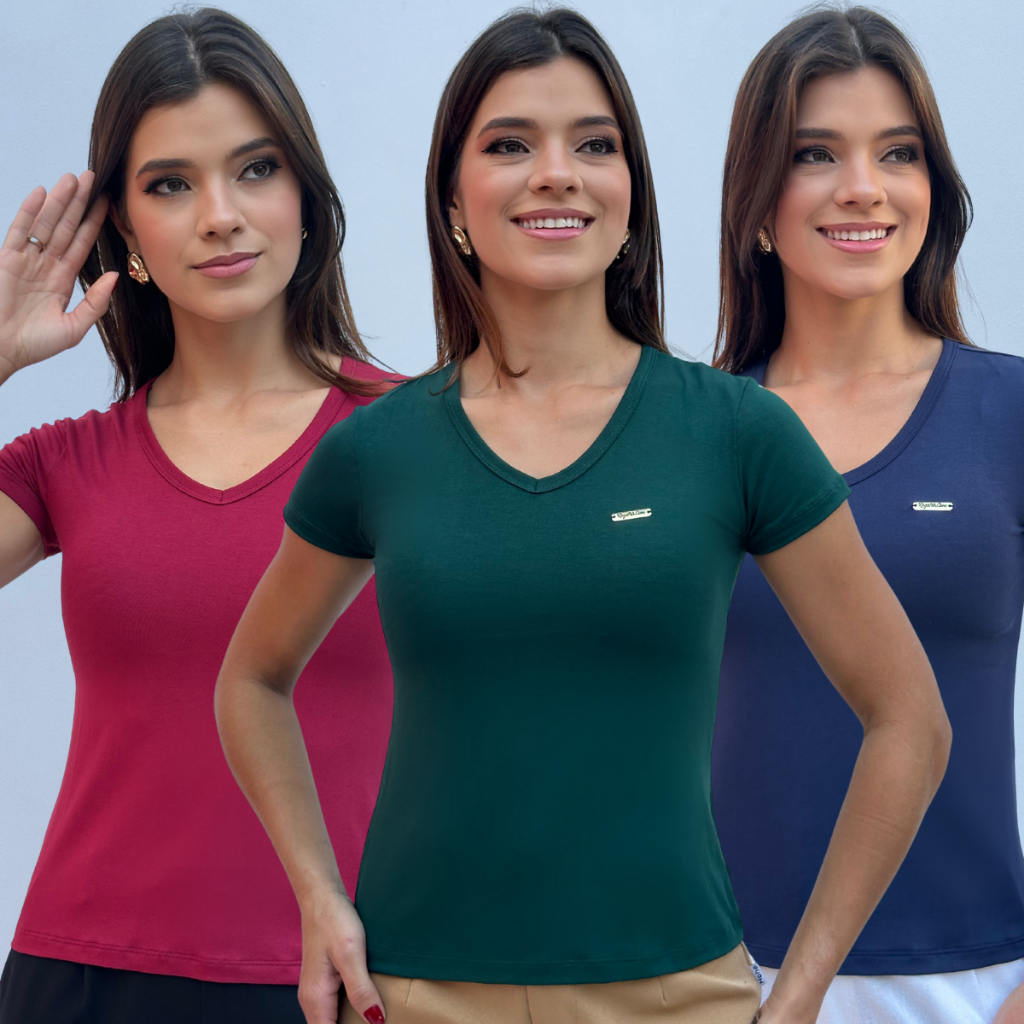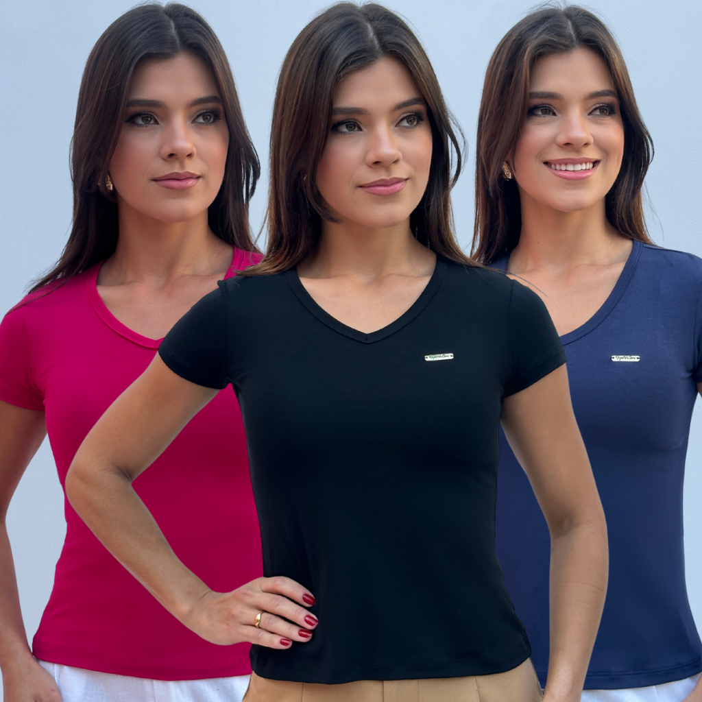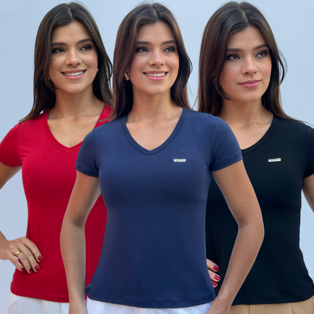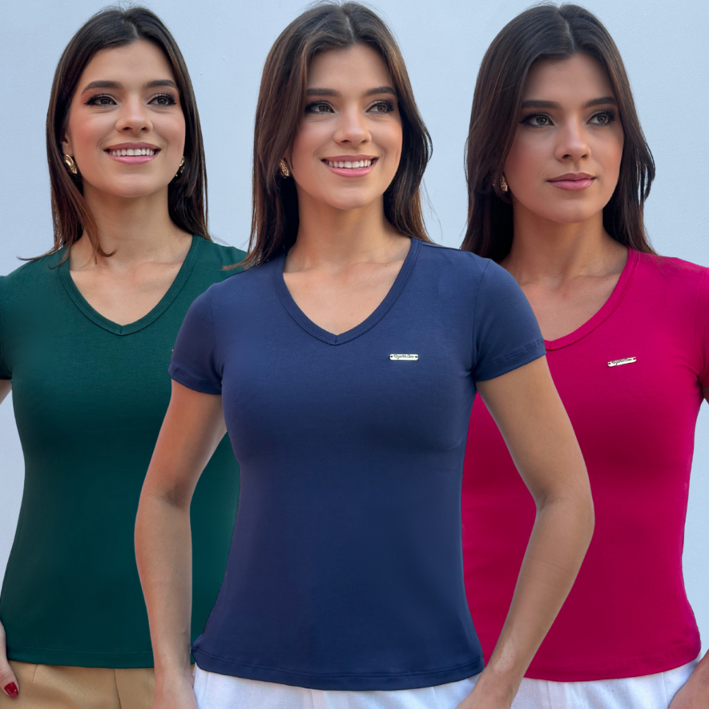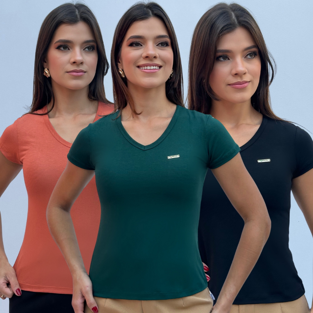 Kit 3 Baby Look Gola V Moda Básica Atual Blusa Feminina Malha Viscolaycra Manga Curta Confortável Elegante Moderna