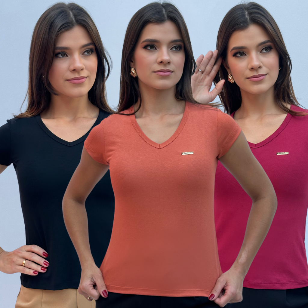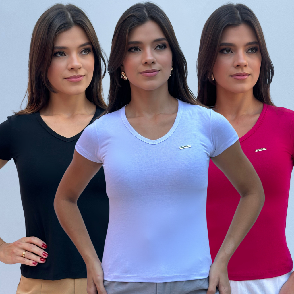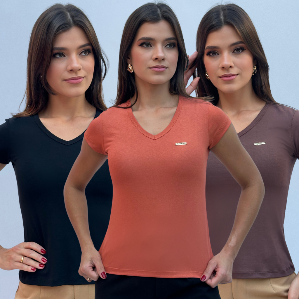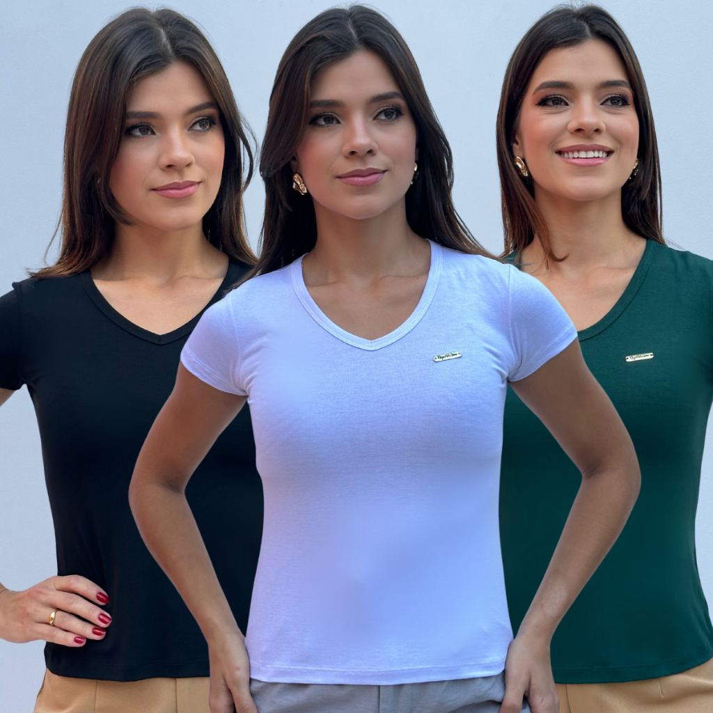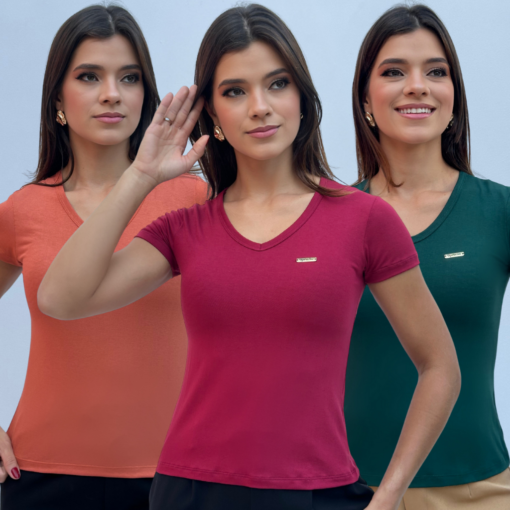 Kit 3 Baby Look Gola V Moda Básica Atual Blusa Feminina Malha Viscolaycra Manga Curta Confortável Elegante Moderna