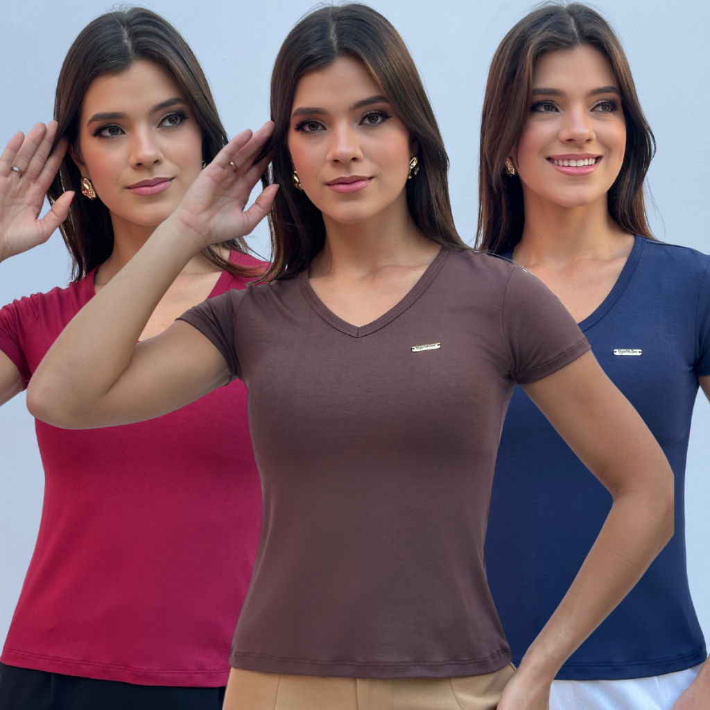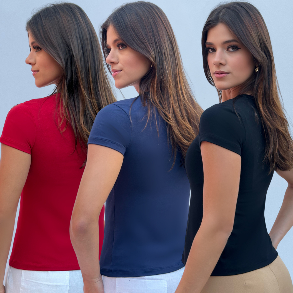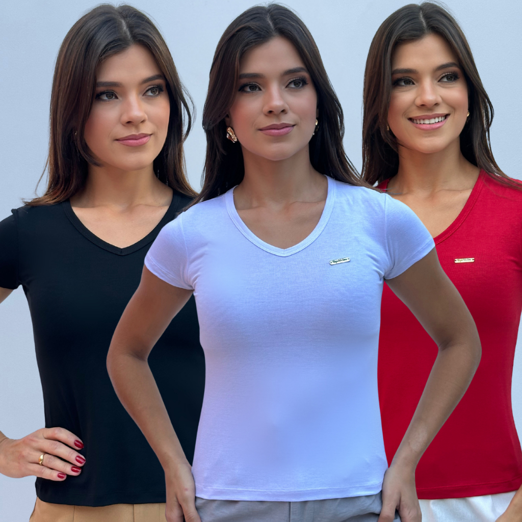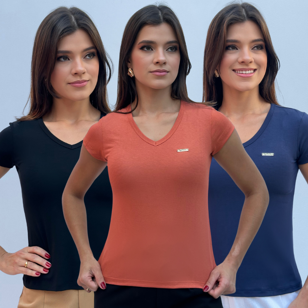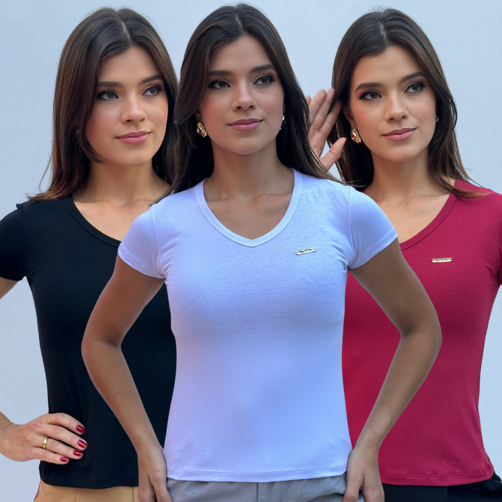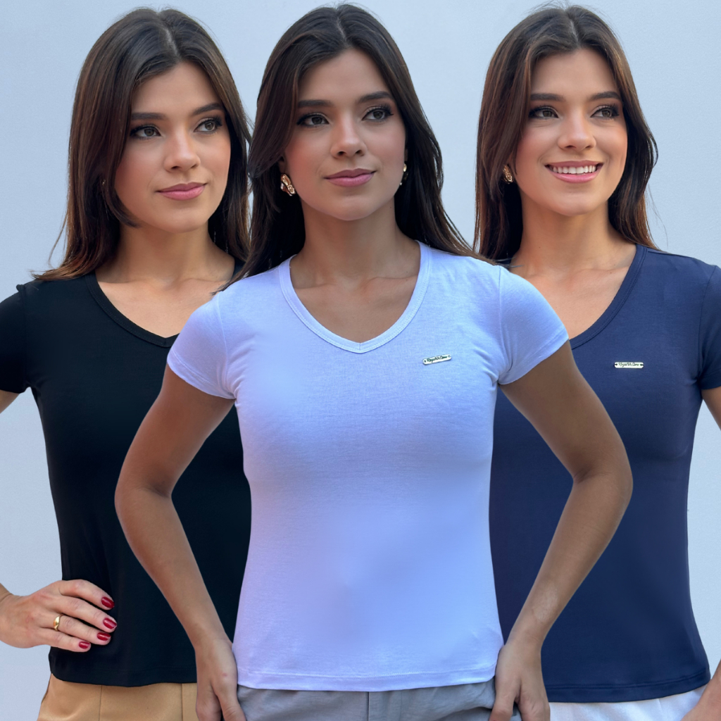 Kit 3 Baby Look Gola V Moda Básica Atual Blusa Feminina Malha Viscolaycra Manga Curta Confortável Elegante Moderna