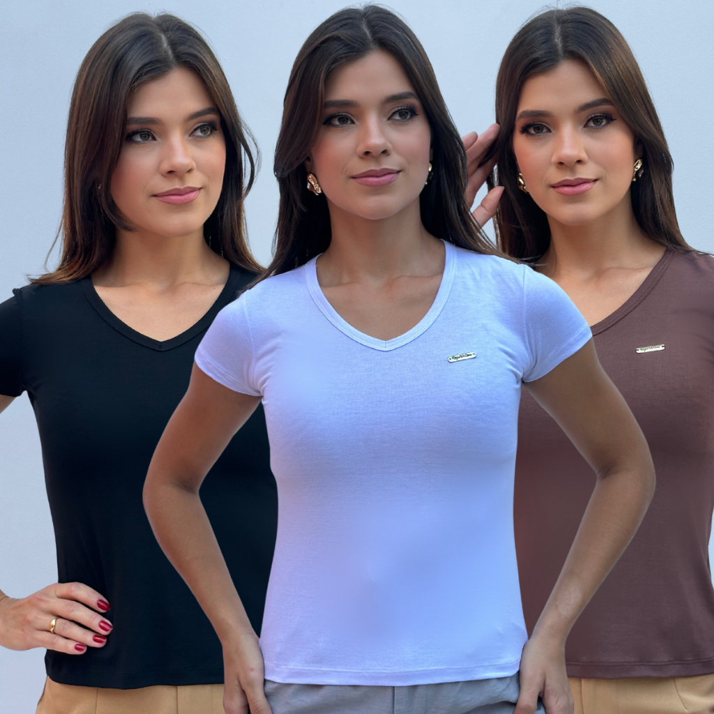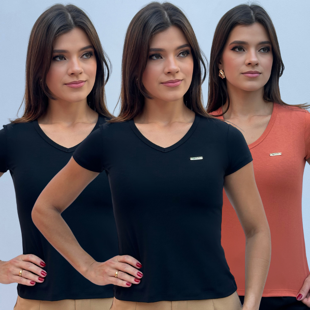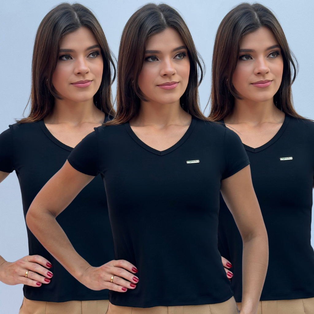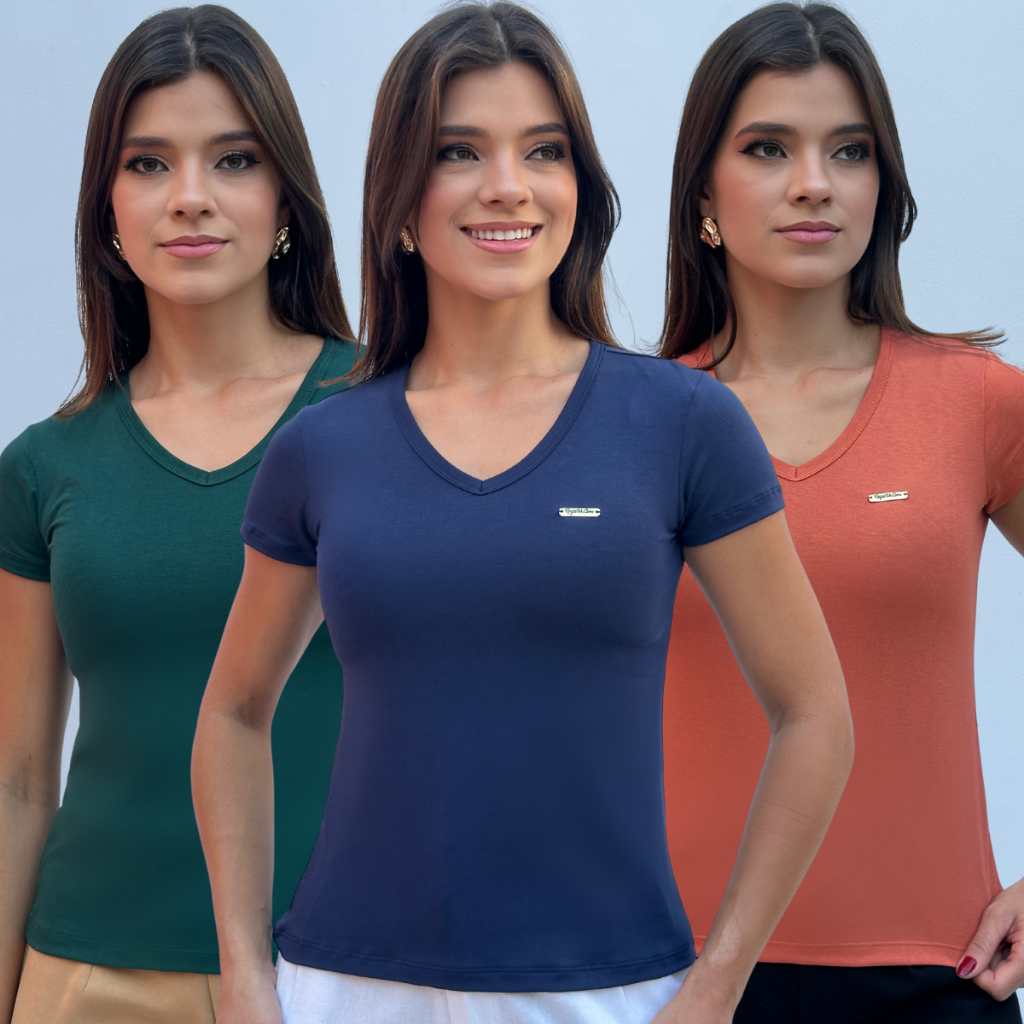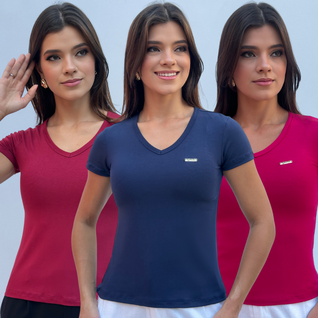 Kit 3 Baby Look Gola V Moda Básica Atual Blusa Feminina Malha Viscolaycra Manga Curta Confortável Elegante Moderna