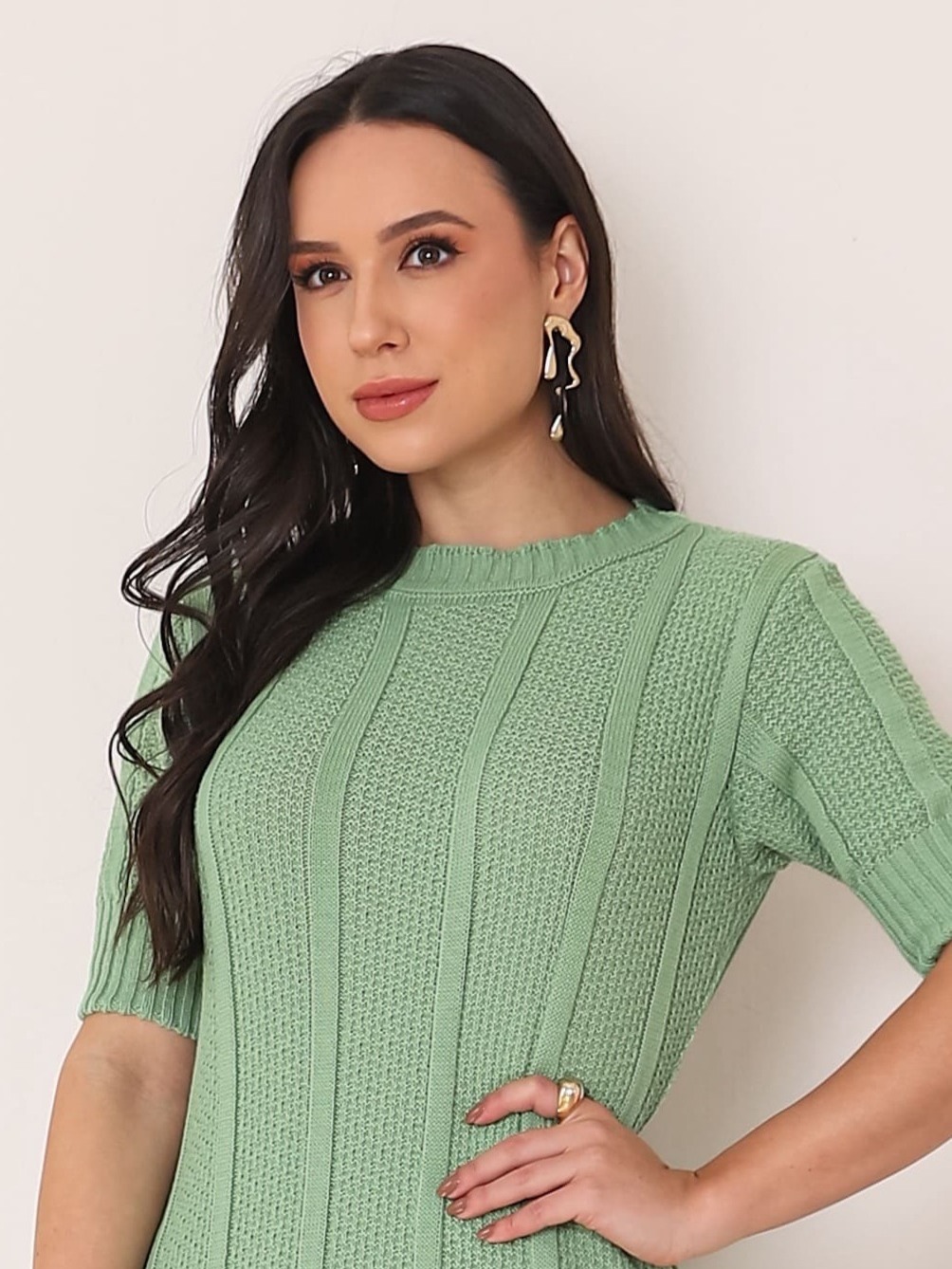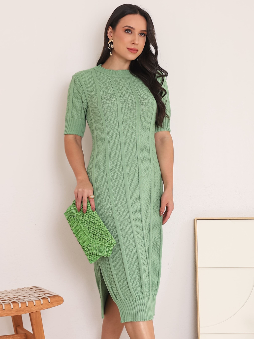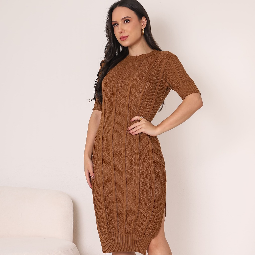 Vestido Feminino Moda Evangelica Midi Tricot Gola Redonda Modesto e Moderno Verão 2026