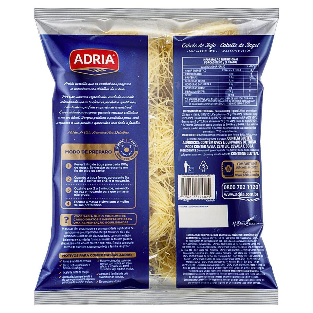 Kit 2un Macarrão Cabelo De Anjo 500G Adria Massa Com Ovos
