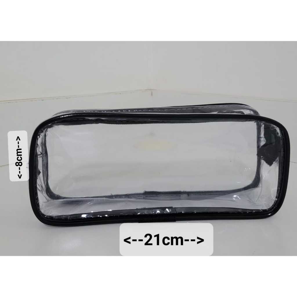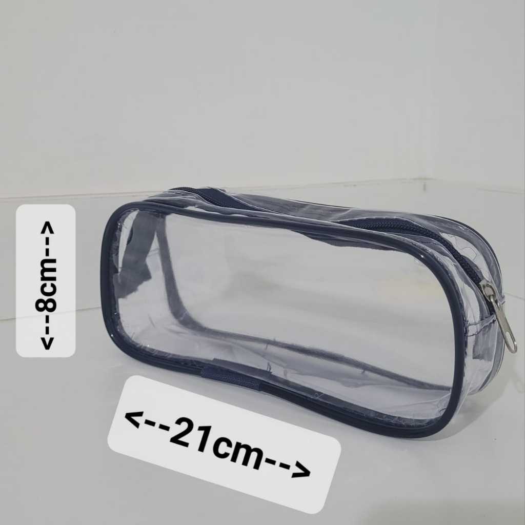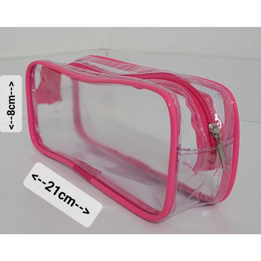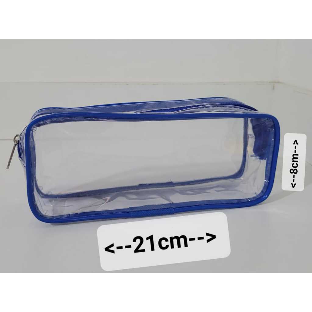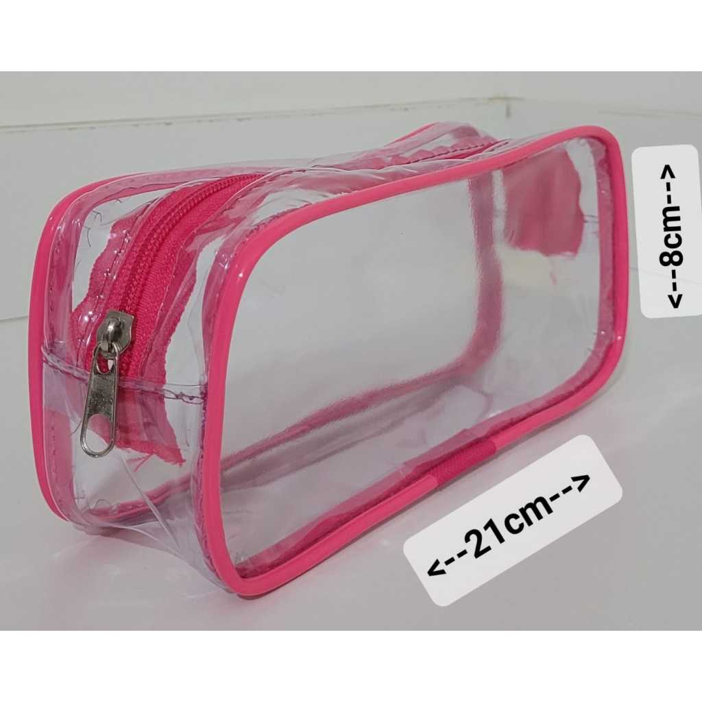 ESTOJO TRANSPARENTE COM FRISO COLORIDO COM 1REPARTIÇÃO PARA ESCOLA E MAQUIAGEM