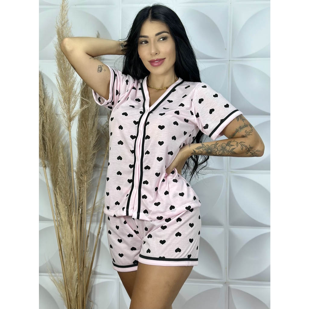 Pijama Curto Baby Doll Americano Blogueirinha Sem Gola com Botão Feminino Adulto Amamentação gola V