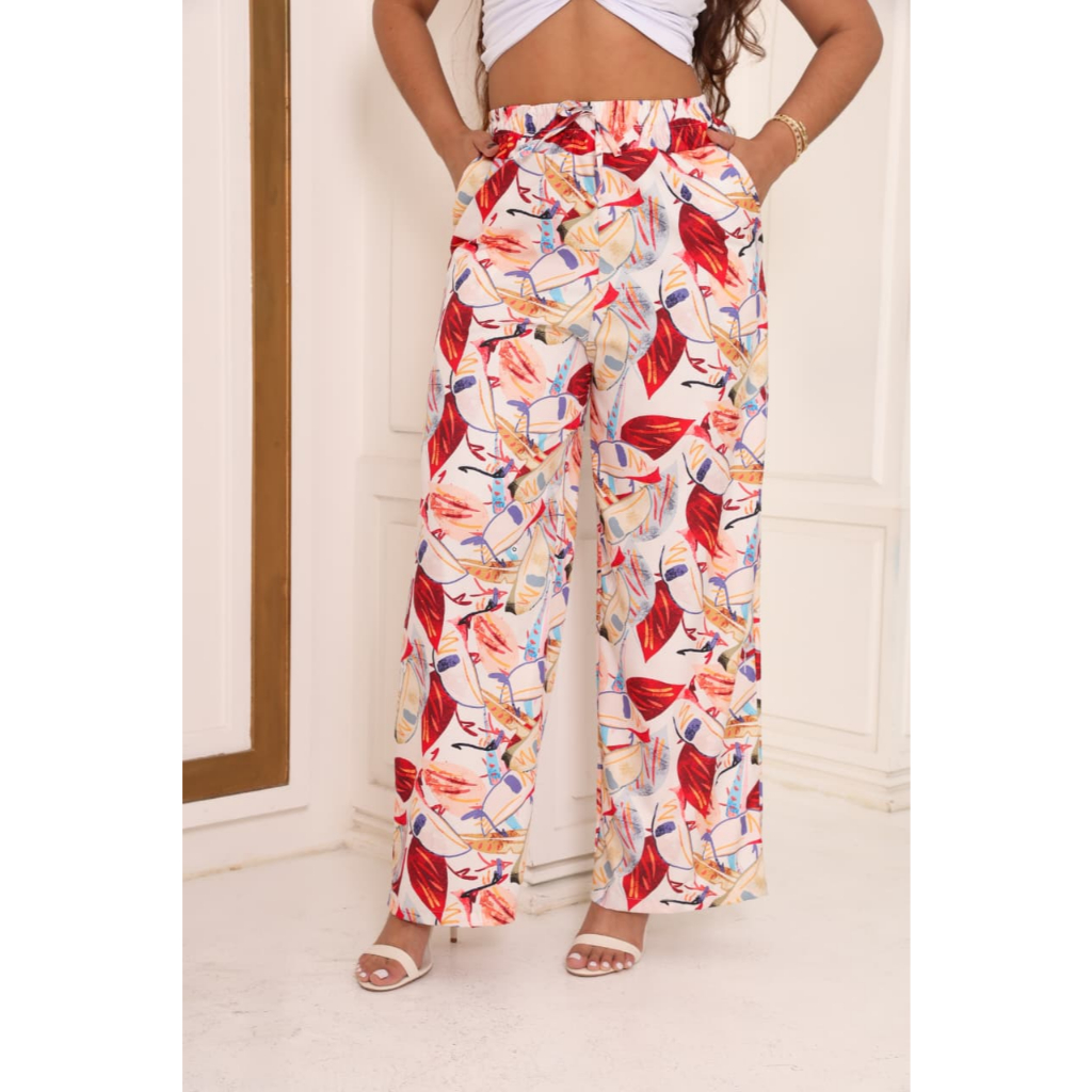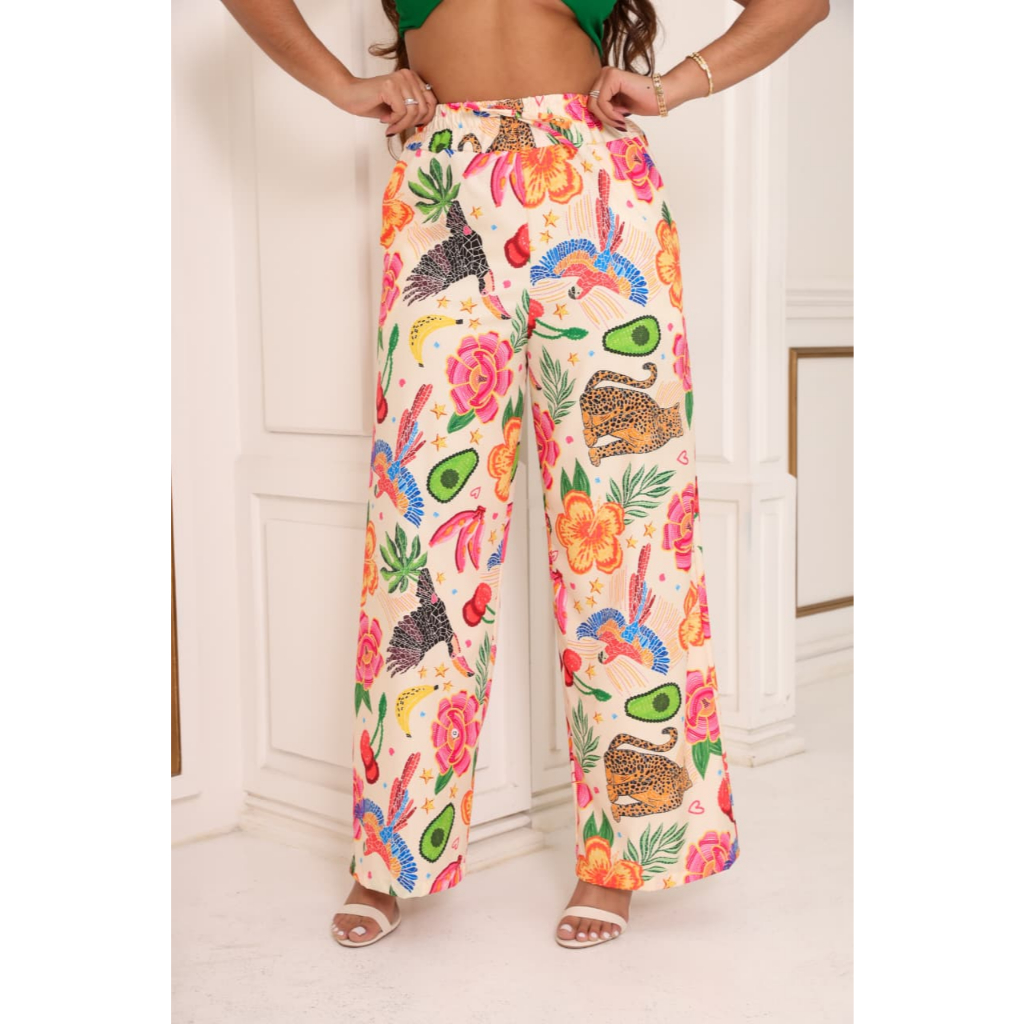 calça pantalona estampada cintura alta com bolso e elastico na cintura tecido crepinho elegante