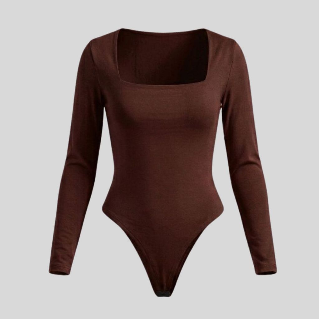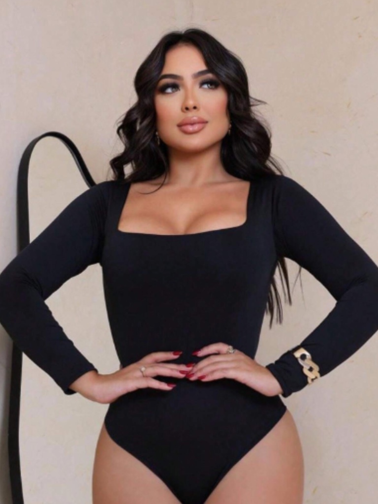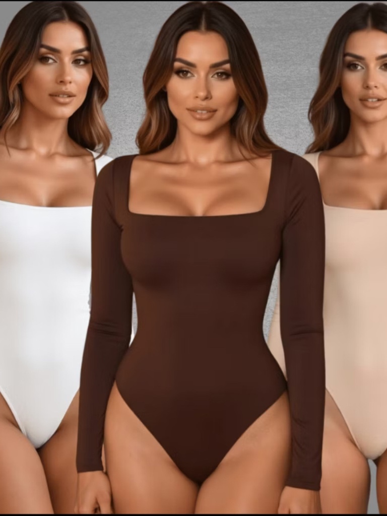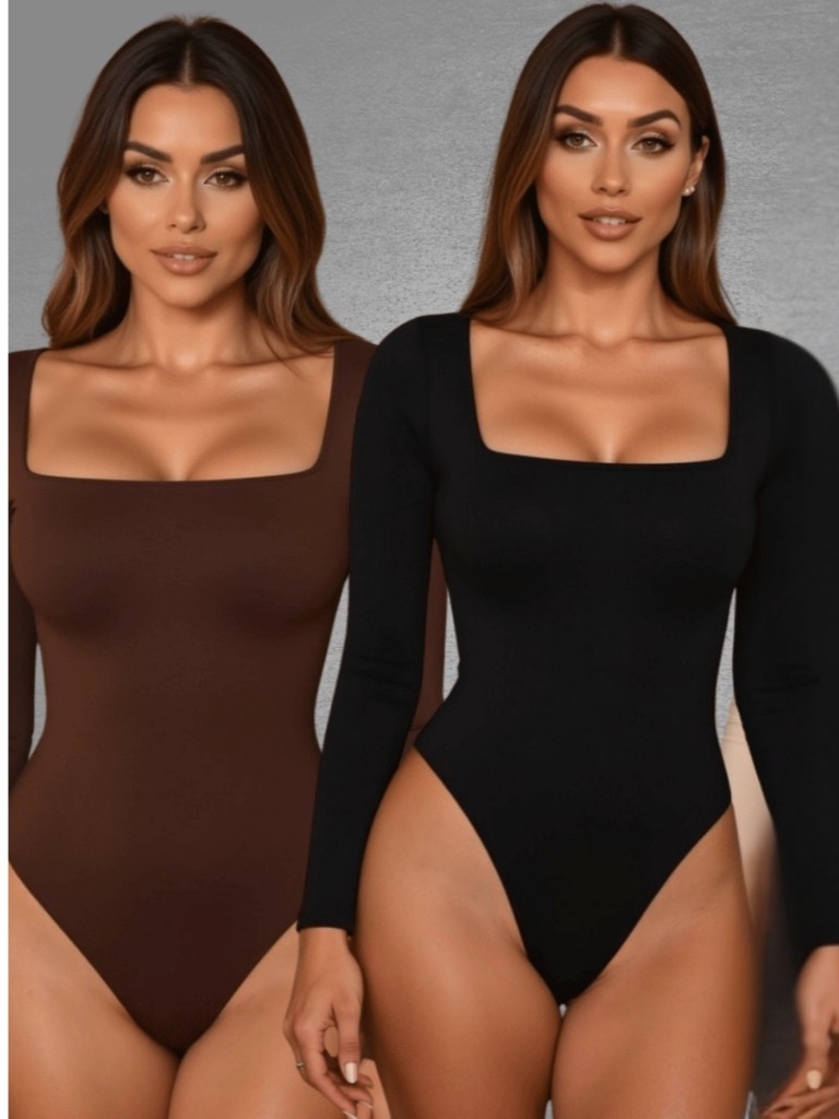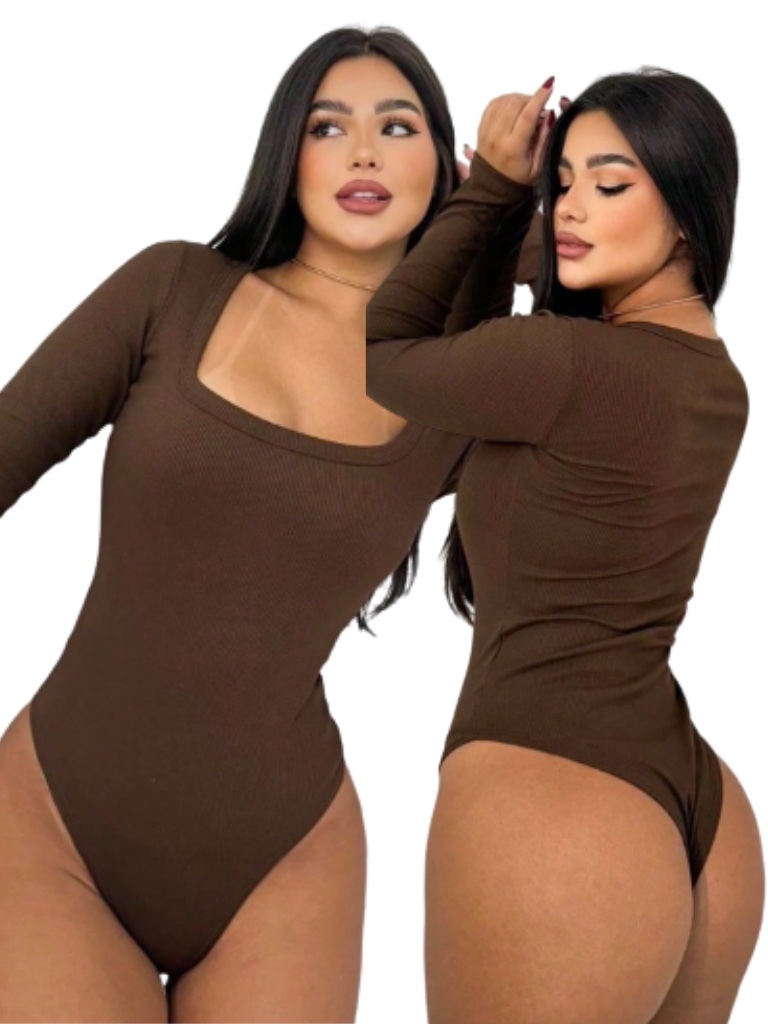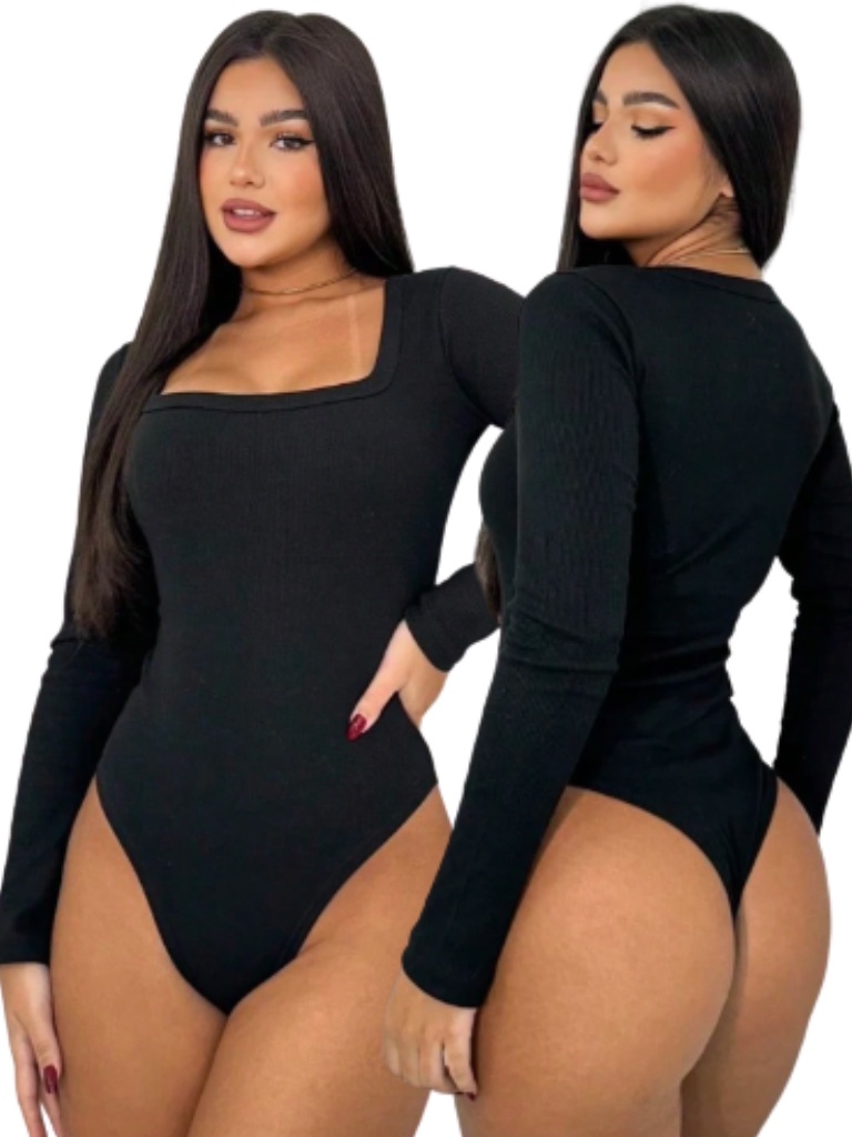 Body Casual Feminino Decote Quadrado Forrado Manga Comprida Tecido Suplex Básico Bori Outono Inverno