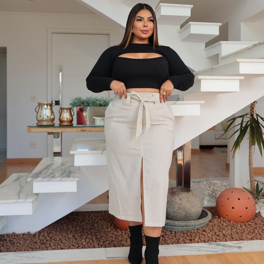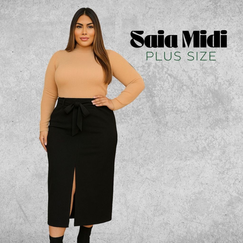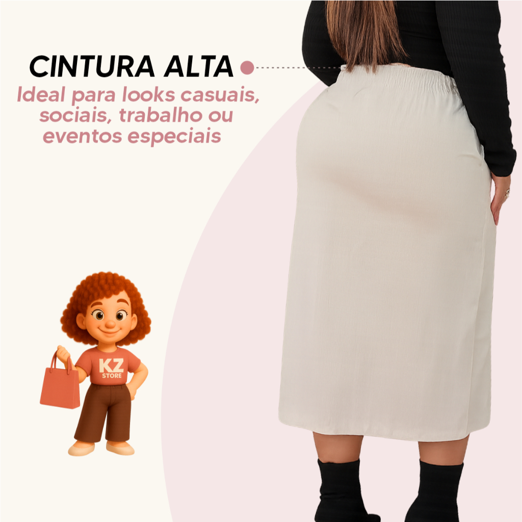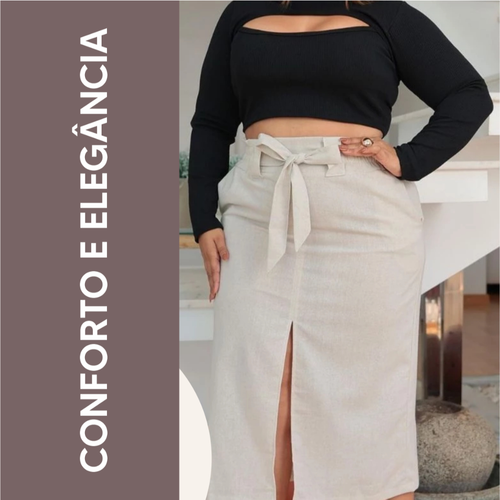 Saia Midi Plus Size em Linho com Fenda Frontal
