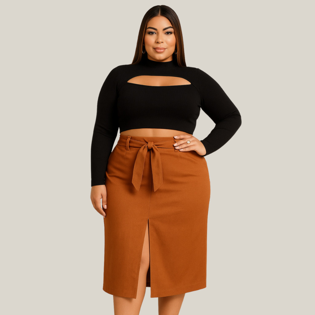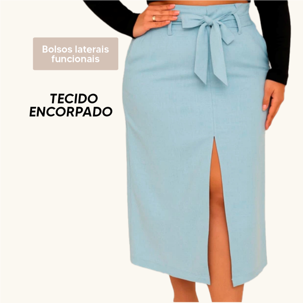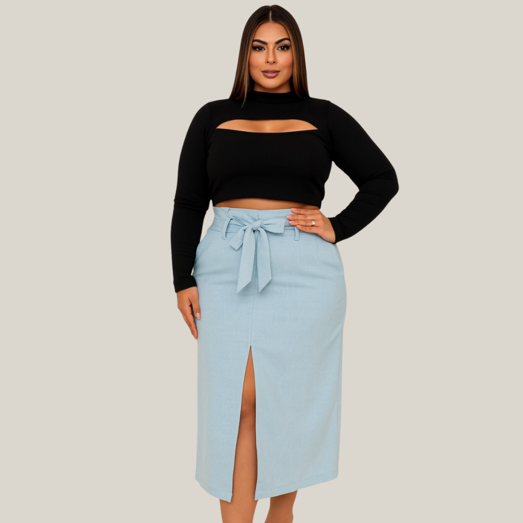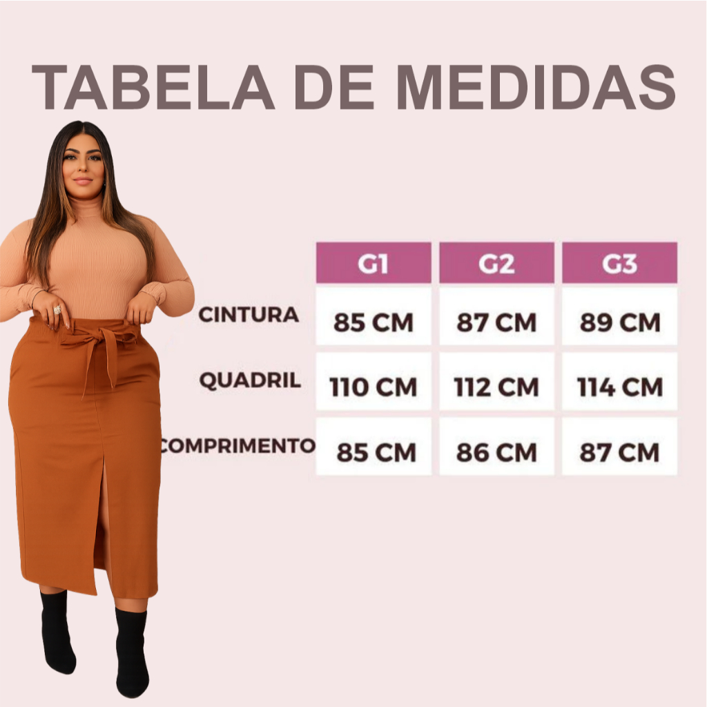 Saia Midi Plus Size em Linho com Fenda Frontal