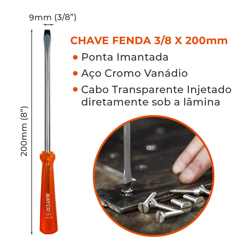 Chave de Fenda 3/8 x 200mm Aço Cromo Vanádio Profissional