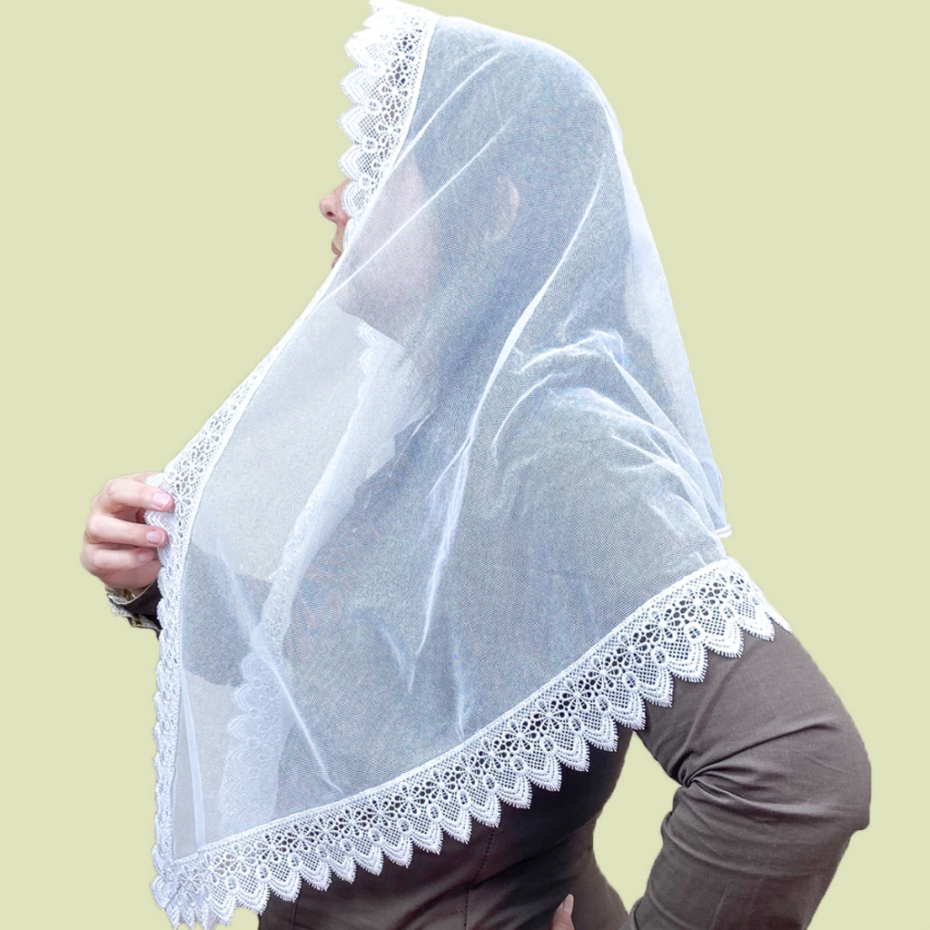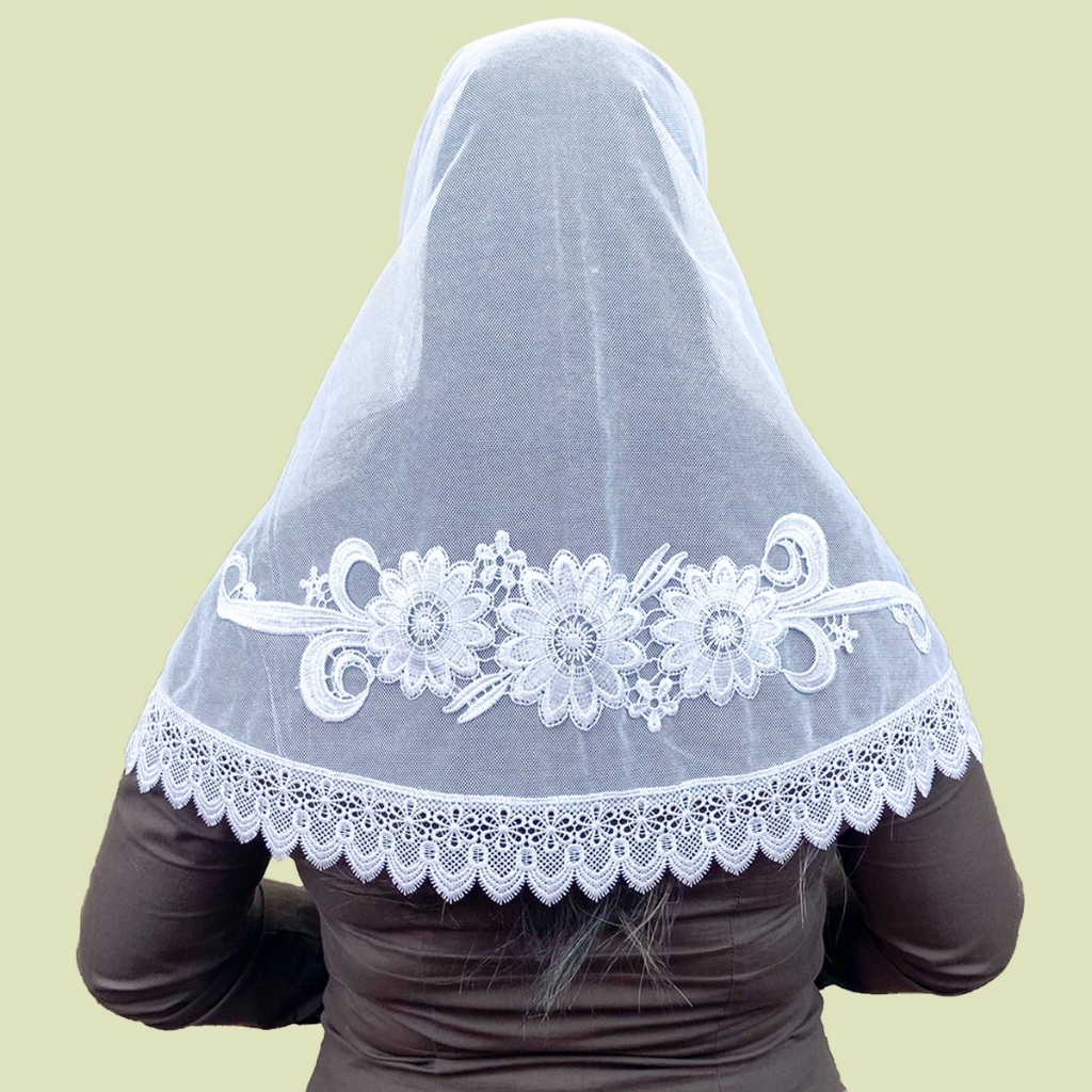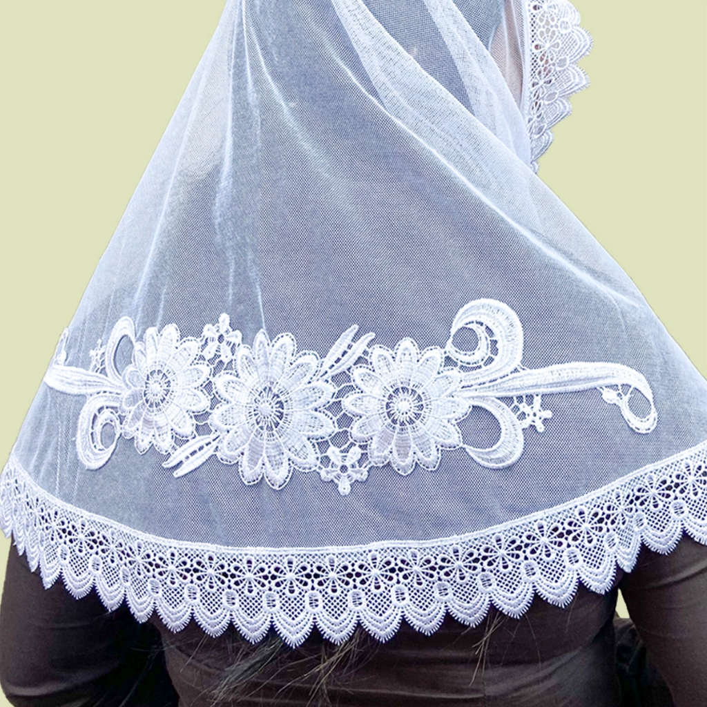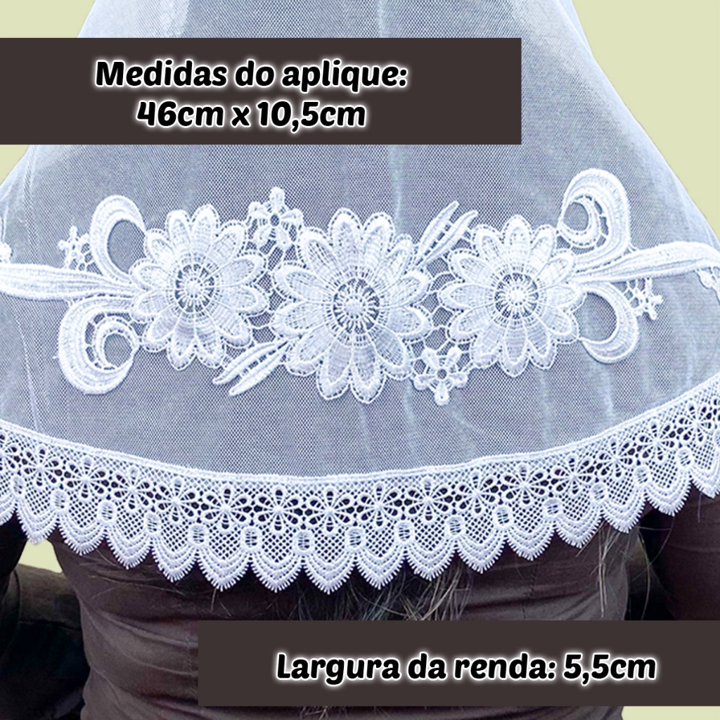 Véu Ccb Adulto Renda Guipir Média Com Aplique Floral (modelo Marta)