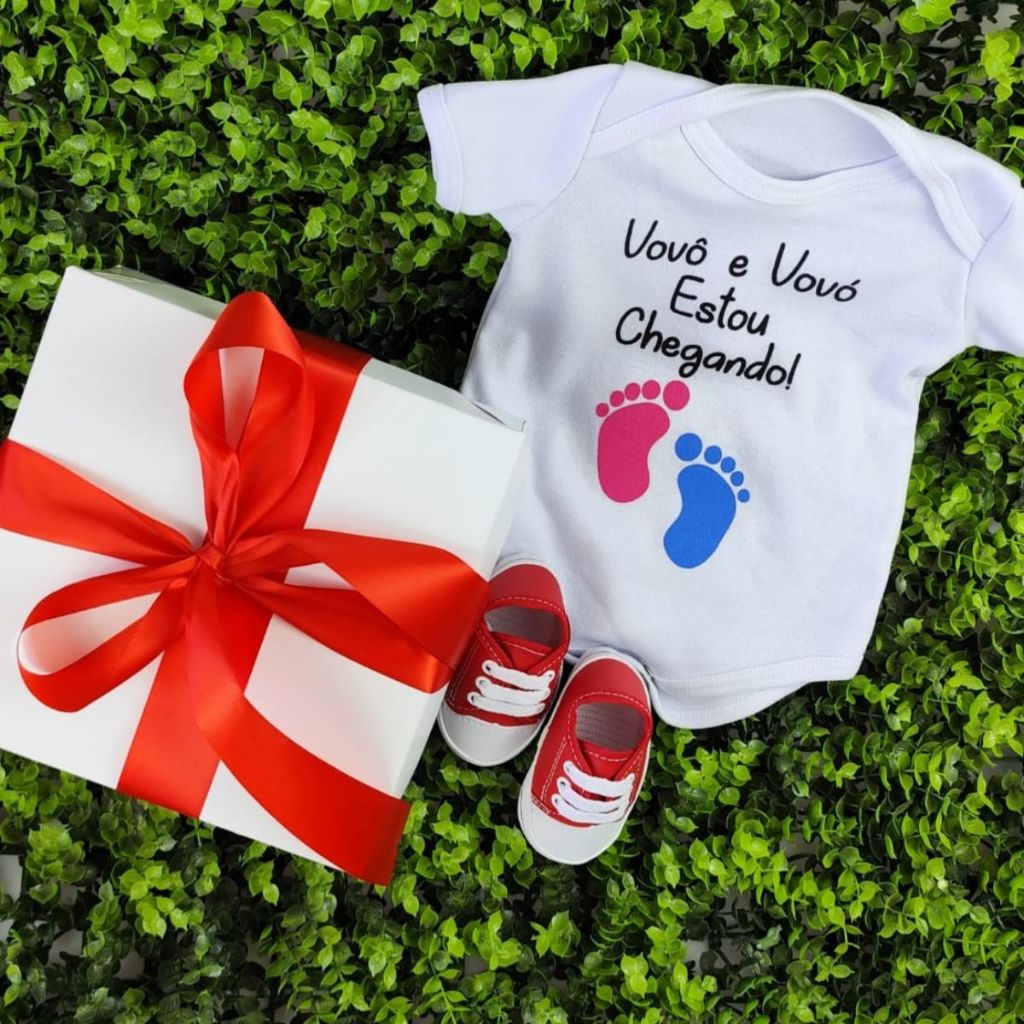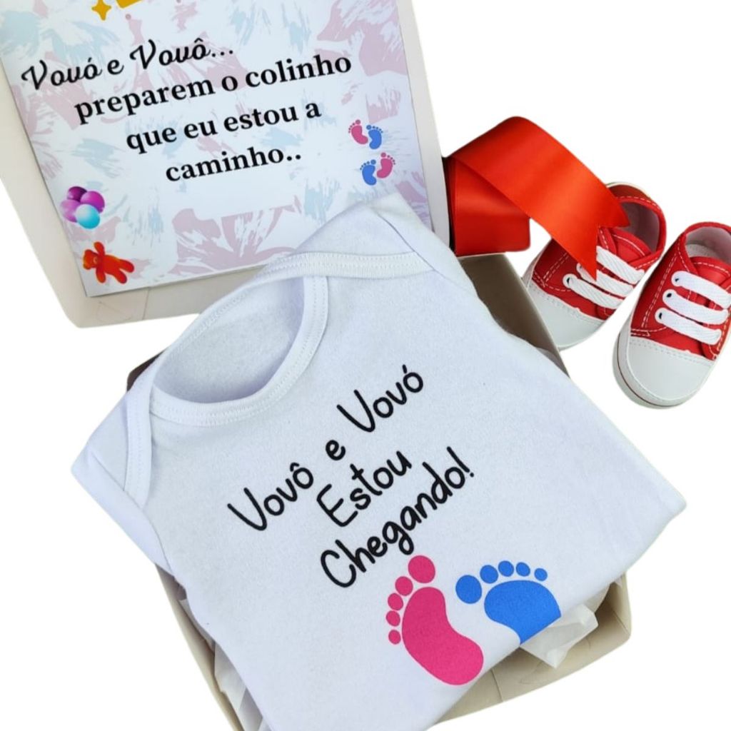 Caixinha Revelação de Gravidez Surpresa com Body Manga Curta e Sapatinho Anúncio Grávida