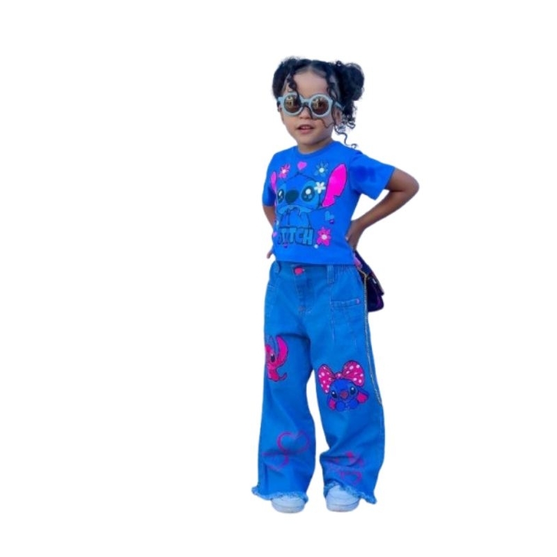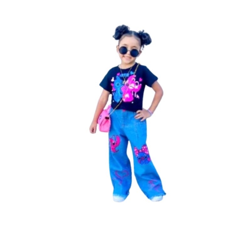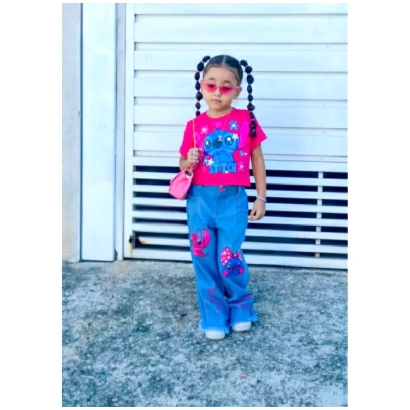 Conjunto infantil menina juvenil Blusinha STiTCH Calça Wide Leg + relógio