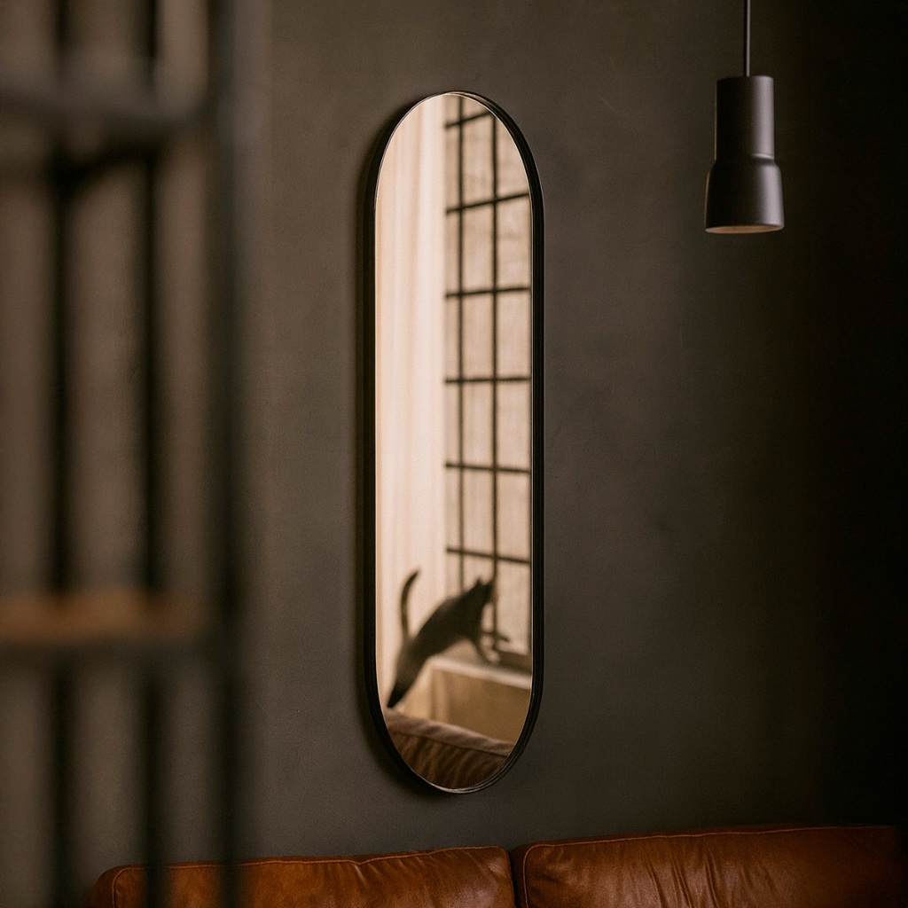 Espelho Pílula 36x146cm | Suporte de Parede | Couro Orgânico | Corpo Inteiro