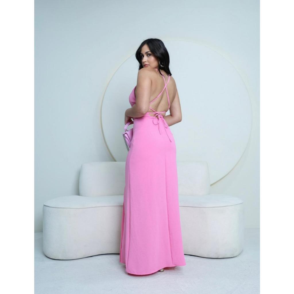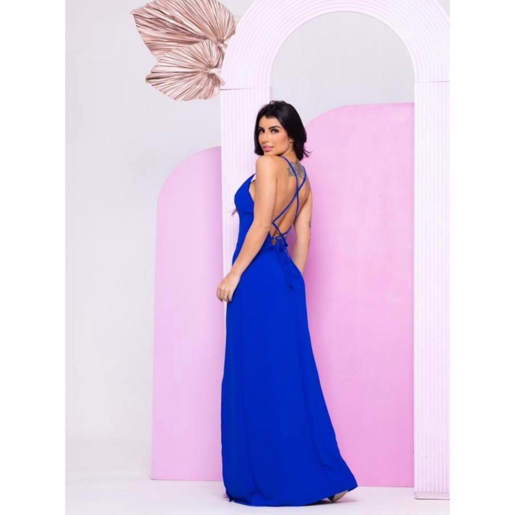Vestido longo Costa nua com fenda amarração bojo zíper invisivel atras moda feminina lançamento
